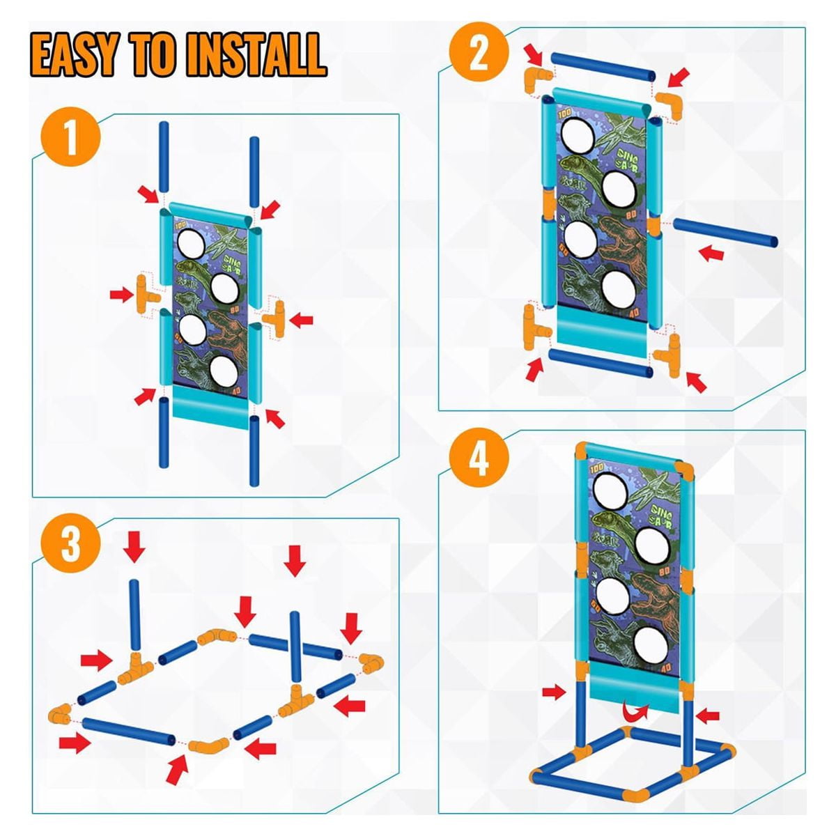 $51.59Description: Shooting Target for Kids, Dinosaur Shooting Games for 5 6 7 8 9 10+ Year Old Boys, Electronic Shooting Target Toy with Target Stand, 2 Popper Air Guns & 20 Foam Balls, Compatible with Nerf Gun Features: ??【Shooting Game Outdoor Toys】The kit includes 2 pack dinosaur air blasters, 20 soft foam balls, 20 official darts, 2 bullet adapters and 1 dinosaur-themed standing shooting target. Whether play independently or as a team against each other, it’s flexible enough to meet all your needs. Good choice for indoor & outdoor activities ??【Dinosaur Design Kids Toys】Vivid T-Rex dinosaur shaped gun and dinosaur-themed standing target will bring kids into a fantastic Jurassic World. Press the button on the head of dinosaur to light up the eyes and press the trigger to make a realistic dinosaur roaring sound. All those dinosaur related elements give your children endless fun ??【Easy to Operate Educational Toys】Each air-powered gun blaster can hold 9 foam balls, fire them into different scoring pockets to get as many points as possible. Kids can change launch head and shoot with soft darts. The shooting target is easy for kids to put together. This dinosaur game help improve hands-on and spatial perception ??【High-Quality & Safe Crafts】Made of high-quality, non-toxic and recyclable ABS plastic. Firm structure ensures that the gun can withstand the air impulse without falling apart. The very light-weighted sponge balls do no damage to their targets — household items, and people, even the kids can battle each other with the foam balls ??【Ideal Kids Birthday Gifts】Sulobom dinosaur shooting game play set is incredibly fun and well-packaged, so it’s perfect to be served as a boy or girl birthday and holiday gift for Easter, Thanksgiving, Christmas, New Year Eve and so on. We highly recommend this dino toy gift for kids age 4-5 & age 6-8 and let them stay away from electronics Specifications: Target stand size: 39.4″ H x 15″ W Popper gun size: 14.9″ Foam ball size: 1.1″ Material: PVC, EVA Package weight: 3.5lb Package Inchludes: 2 x Popper gun 1 x Moving shooting target 10 x Yellow foam balls 10 x Blue foam balls