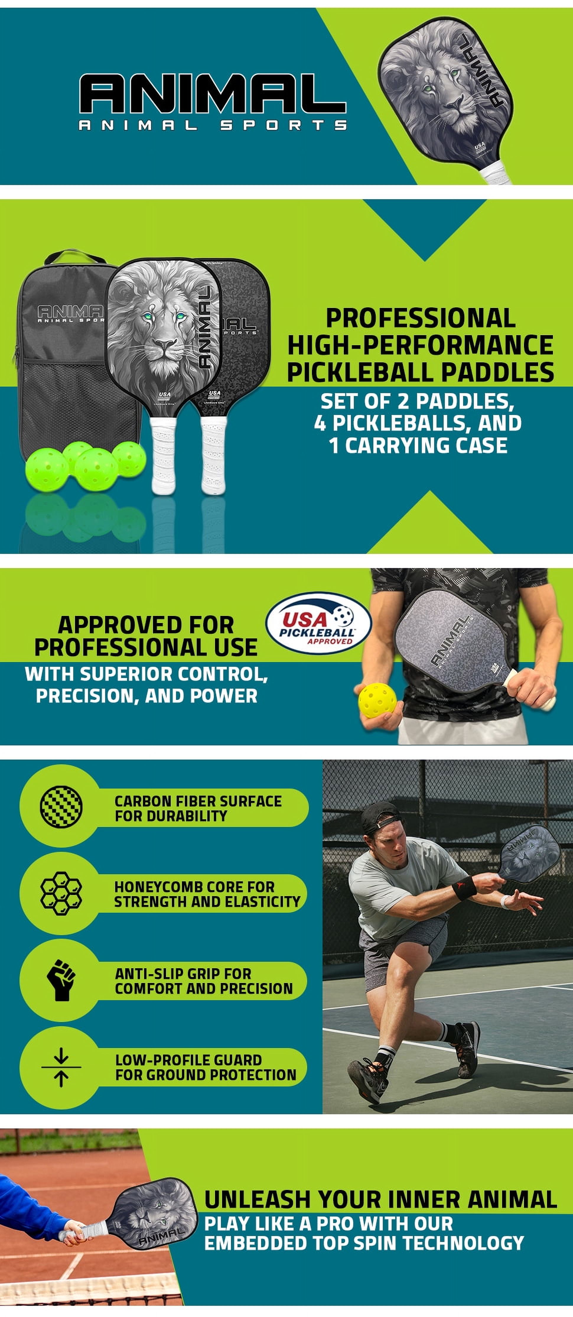 ANIMAL SPORTS Pickleball Paddles Set of 2 – Carbon Fiber Paddles, USAPA Approved Bundle of 2