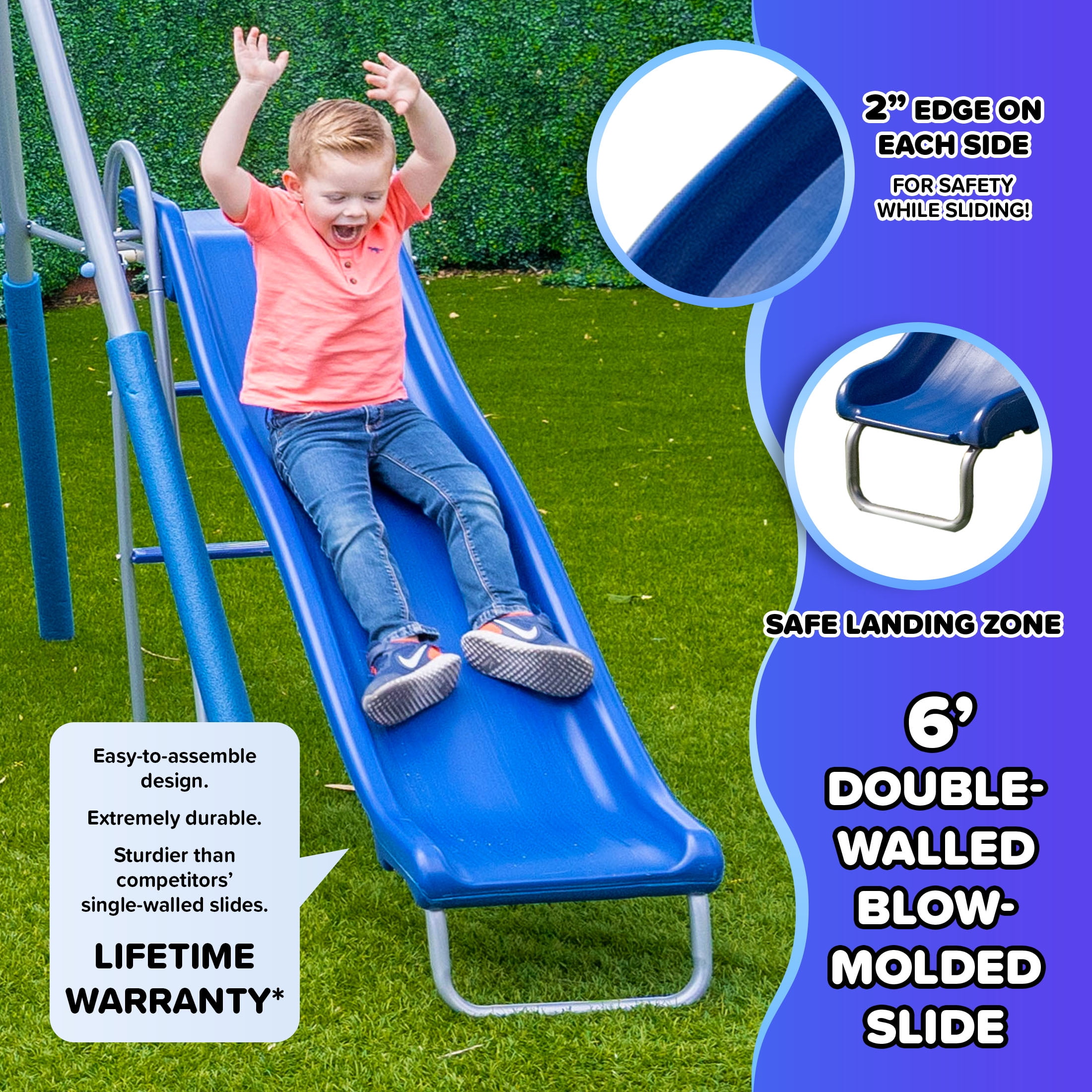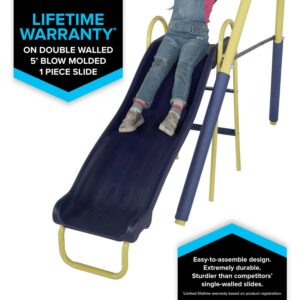 $197.79Stay active with the Sierra Vista Metal Swing and Slide Set! With two blow-molded swings, a wavy slide and a trapeze with a handle, this swing set is sure to become an outdoor favorite with kids. These four stations will provide your kids with hours of exciting fun! Kids can swing to their heart’s content with 2 classic swing seats or on the trapeze with handles for a more acrobatic style of play. For those looking for a little more action, the 5-foot wavy slide offers a thrilling ride that will get kids active and playing happily. Parents can feel secure knowing the play set is constructed from 2-inch heavy-duty, weather-resistant steel tubes and hardware covered in a powder-coated paint finish that delivers superior toughness and durability. The Sportspower Sierra Vista Metal Swing and Slide Set is ideal for medium to large backyards and supports up to 4 kids playing at once. Supports kids up to 100 pounds each, up to 400 pounds total. Recommended for children 3 to 8 years old. Measures 124″L x 102″W x 72″H when assembled. This swing set was designed with safety in mind, which is why we’ve included a BONUS 4pc anchor kit.