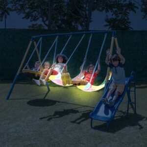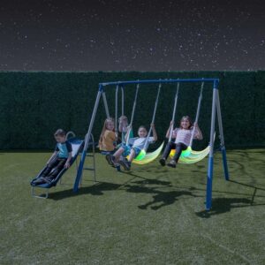 Sportspower Super Lights Metal Swing Set with LED Swing Seats, 2 Person Glider, 5′ Slide with Lifetime Warranty, and Bonus Anchor Kit, Great for Kids 3-8
