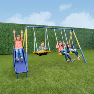 Sportspower Super Saucer Metal Swing Set with 2 Swings, Saucer Swing, & 5′ Double Wall Slide with Lifetime Warranty