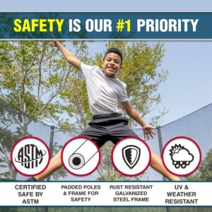 $343.97TruJump wanted to design an all-in-one trampoline that your whole family will love and have fun! The all new TruJump15ft trampoline and enclosure combo is designed for a decent size yard and came with a new innovative anchor system that allows the trampoline to be anchored in any ground condition to prevent strong winds from moving your trampoline. The basketball system is easy to install on the enclosure pole, and the soft breakaway rim makes it safe for kids to dunk. TruJump trampoline is all about safety and encouraging your kids to go out and exercise more! Powered by safety 6-pole enclosure, kids can soar to a new height of backyard fun and keep safe inside the trampoline. This trampoline features 220 lb weight capacity with an durable, UV resistant trampoline park quality jump mat built on a thick walled and double galvanized steel frame. This 15ft trampoline can handle any trampoline exercise routine in your backyard.