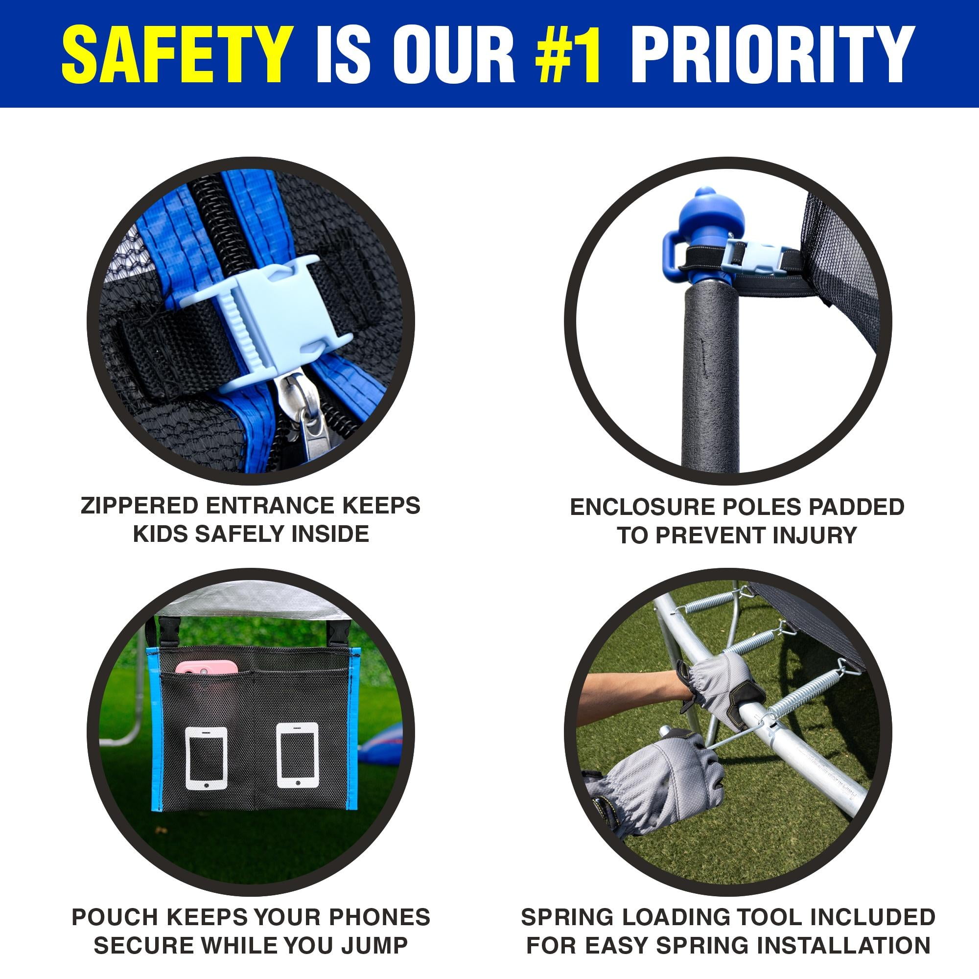 $257.99Keep little ones active and entertained in the backyard with TruJump’s 7 ft My First Trampoline. Designed with safety as the number one priority, the My First Trampoline features a 6-pole, UV-resistant safety enclosure net keeping children safe as they play while providing parents with unrestricted visibility. This kid’s trampoline also includes a padded spring cover, and UV-resistant jump mat sewn together to prevent any unwanted contact with the springs. Blow-molded, plastic legs maintain balance and stability while foam padding on the frame poles provides an additional layer of safety. Kids can enter and exit easily through the zippered opening. The TruJump 7 ft My First trampoline is easy to assemble, offering convenience and saving time.