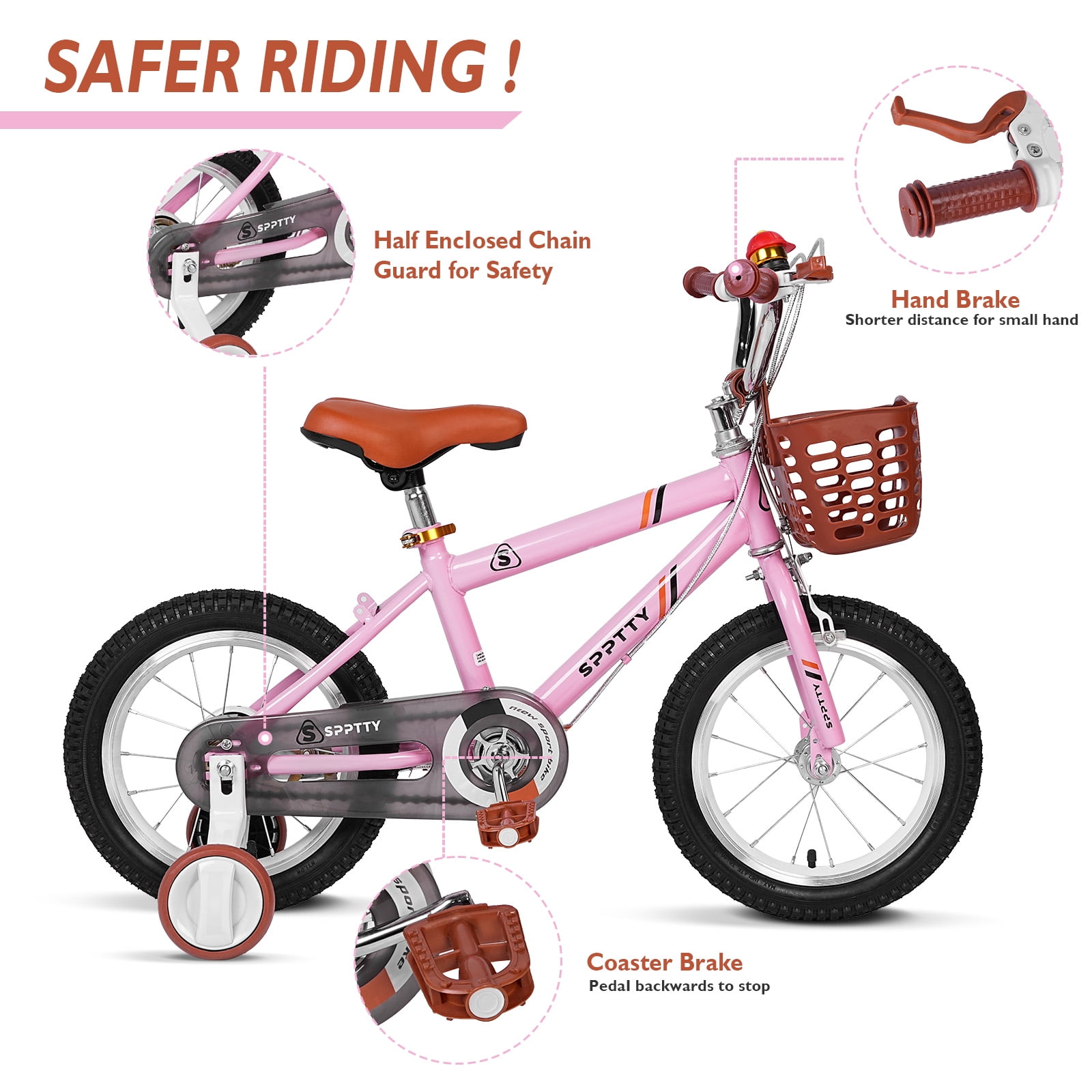 $137.58Original price was: $137.58.$73.94Current price is: $73.94.NEW RELEASE Bikes for Boys Girls Kids Bike Installation Video SPPTTY Kids Bike for Girls have adjustable saddle & stem height for a better fit and low gearing for easy pedaling. Their back pedal brakes are safe and the handlebars are easy for little hands to use. A study steel frame with a low stand-over height will make your young rider first bike experience comfortable and confidence inspiring. The Bike for boys is the ideal first bike for kids who are excited to put power to the pedals. High-tensile Frame for long time riding. 85% assembled body, easy to install the bike. Adjustable handlebars. Safety chain cover. White wall tires. Removable training wheels. Durable chromed steel spoke wheels. Decorative fenders and chain guard help protect both bike and rider from unexpected splashes. Recommended age: Child ages 2 to 10 years Ideal rider height: 14” bike is for kids 32- 44 inches tall,18” bike is for children 45 – 56 inches tall. Frame: Strong steel bicycle frame in pink and cyan handlebars:Silver Hi-rise handlebars Seat: padded seat with a quick-release lever for easy height adjustment Rims: girls’ bike rims are made of strong steel in Silver Wide training wheels provide stability Clear assembly instructions included Limited lifetime frame warranty