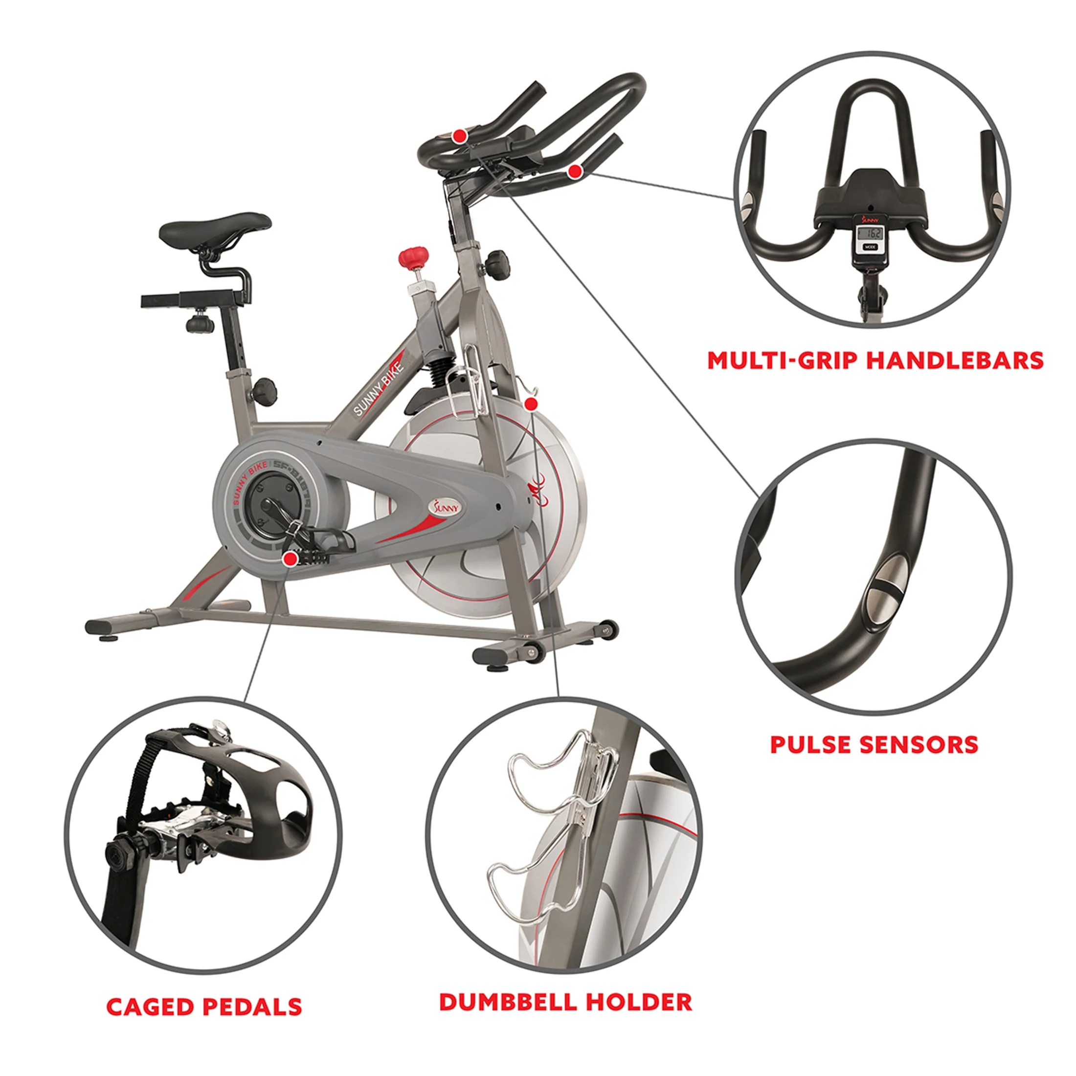 $256.77Start an in-home cardio workout with the SF-B901 Pro Indoor Cycling Bike by Sunny Health & Fitness. Tailor your workouts with the four-way adjustable seat and two-way adjustable handlebars, which are designed around comfort and performance. Feel confident and secure when you slide your feet into the universal toe cages on the stationary bike. Enjoy a smooth and challenging workout experience when you pedal against the consistent chain-drive mechanism using the large muscles of your hips and thighs. Maintain cycling momentum on the fitness bike with the sturdy 40-pound chrome flywheel. Switch up your routine and easily change cycling position on the home exercise bike with the multi-grip handlebars. Increase workout resistance smoothly, effectively, and quietly with the micro-adjustable dual felt-pad resistance. Designed with heavy-duty metal, this bike supports a maximum user weight of 275 lbs. After your workout, move the indoor cycling bike across your home with the built-in transportation wheels. Build a strong cardiovascular system while your burn calories on the Sunny Health & Fitness SF-B901 Pro Indoor Cycling Bike.