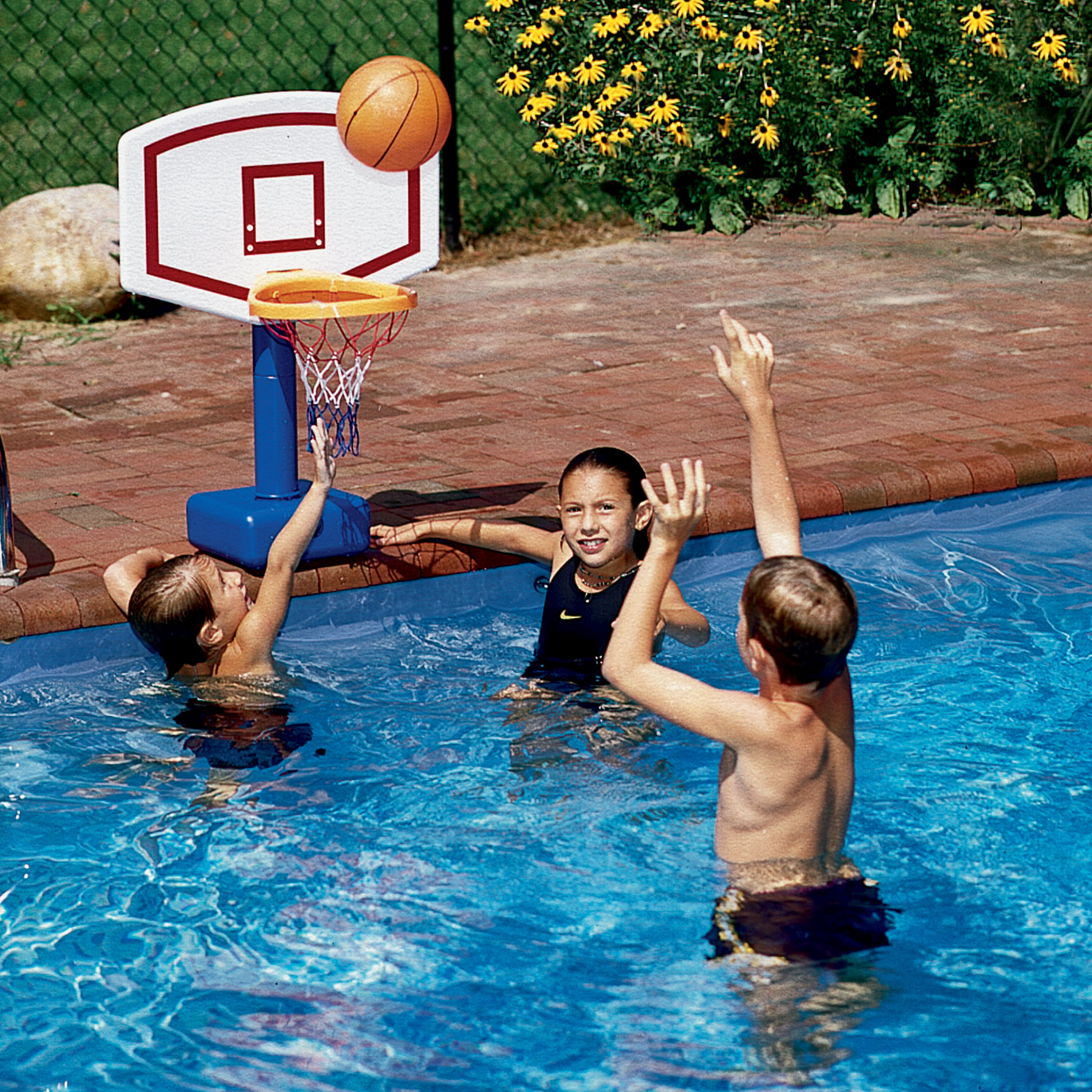 $55.89One of the most fun things to do in a backyard swimming pool is to have a basketball game in the water. Playing a game in the pool is also great exercise for the kids and adults also will enjoy the fun. Whether getting competitive or just fooling around, pool basketball game is fun for swimmers of all ages. This set has a durable basketball backboard that is blow molded plastic with adjustable height. This particular pool game set also includes one basketball and is for inground pools only. Just fill the Base with water or sand to weigh down for hours of fun! Recommended for ages 4 years and up. WARNING: CHOKING HAZARD — Small parts. Not for children under 3 yrs.