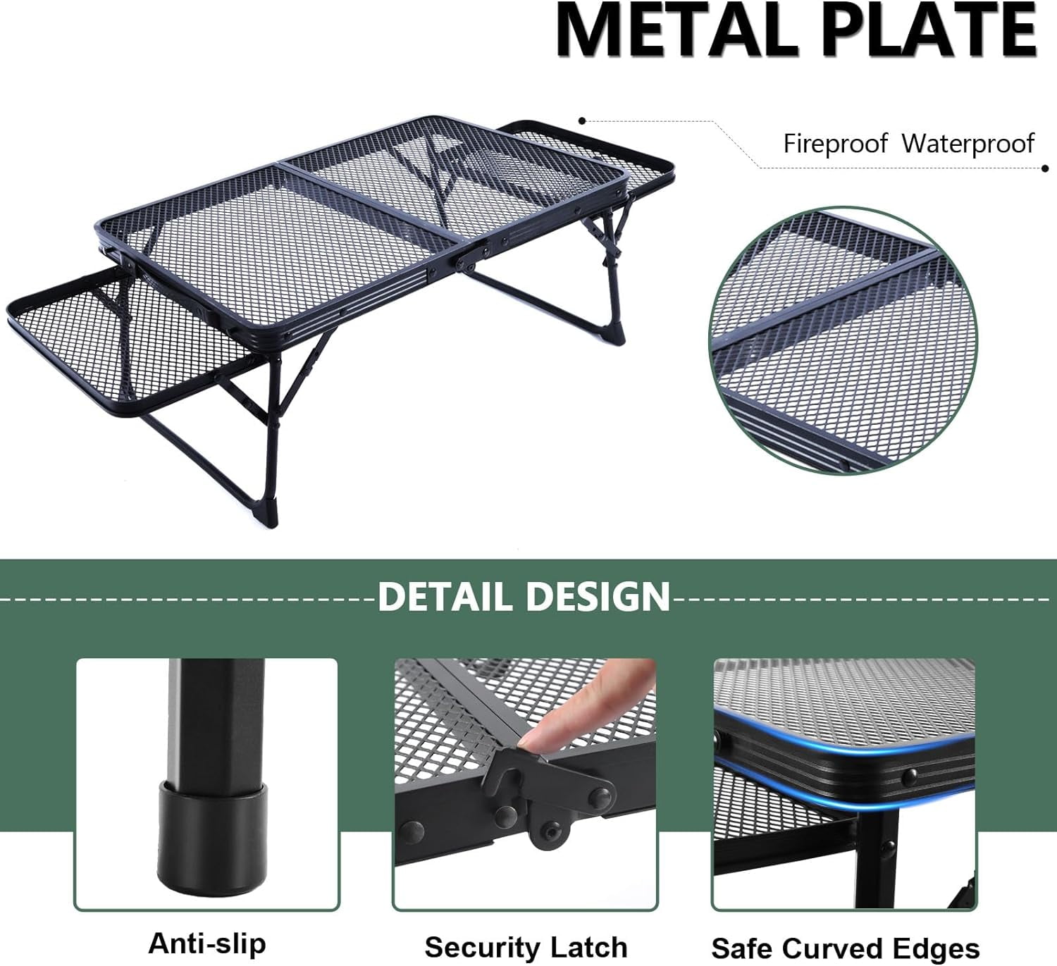 $77.39Original price was: $77.39.$33.53Current price is: $33.53.Low Camping Table with Wing Panels: Low Folding Camping Table features 2 wing panels for added space, perfect for drinks, stoves, snacks, and coffee makers. 2 Side Panels: Small picnic table compared with other small wooden picnic tables, we have a larger table top and are lighter. Whether you’re on a picnic mat or by a campfire, you’ll find it right by your side. Sturdy Low Camping Table: Consists of a durable aluminum frame and a sturdy metal steel mesh table top. It’s very heat and water resistant, you can put your stoves on it, and you don’t have to rush to clear the table on a rainy day. Easy to Set Up: This folding table is foldable and can easily fit into the back of your car, RV or motorcycle. Equipped with a compact carrying handle, it is light and handy.