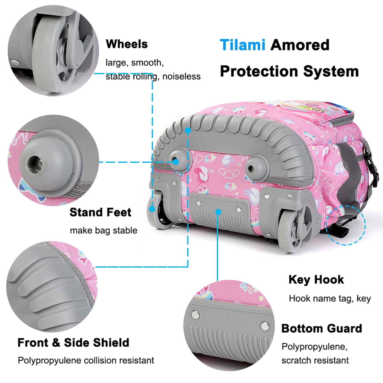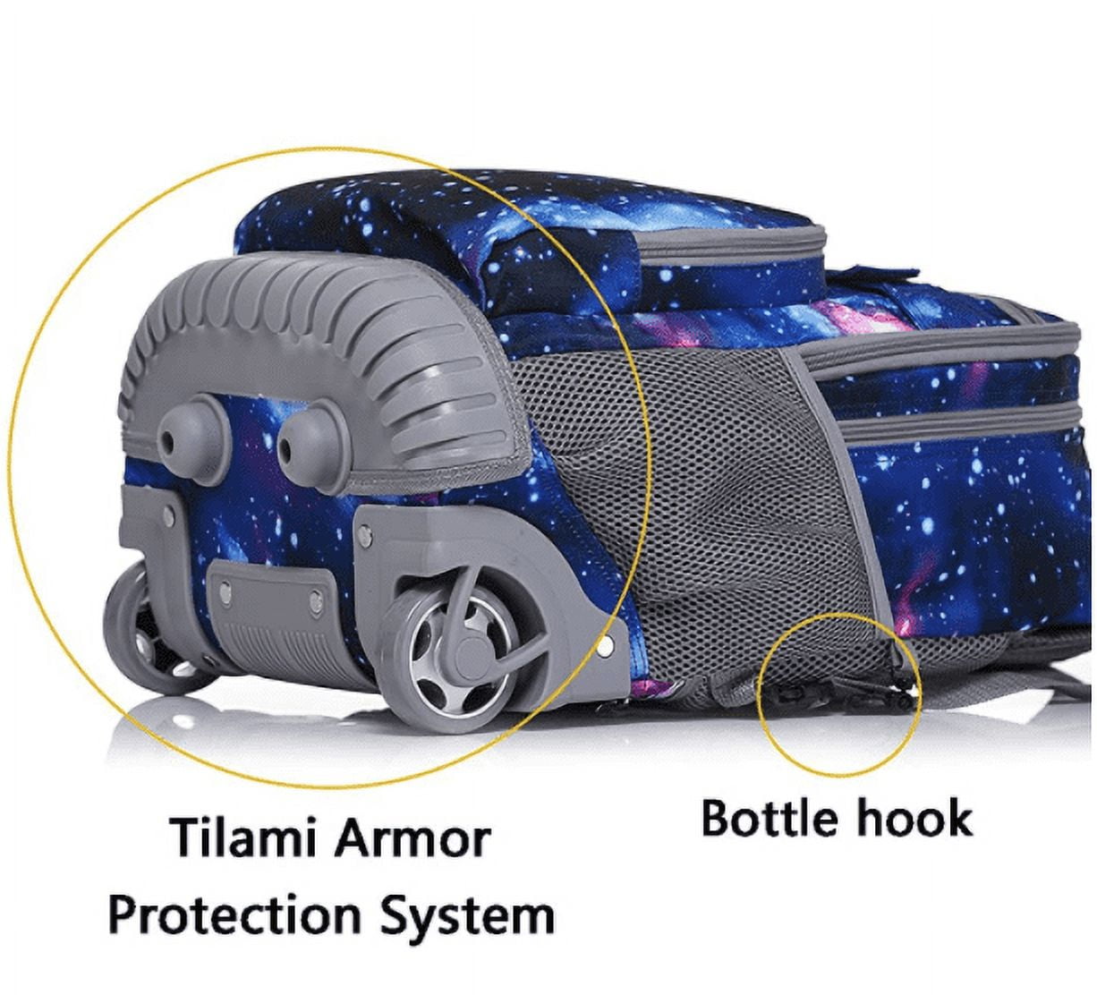 $75.67Maybe you want to know more: Tilami Wheeled Backpack Dynamic design kid’s backpack with wheels, made of high quality durable materials. Equipped with reflective strips for safety, this versatile rolling pack can be carried or rolled with the sturdy aluminum handle. Durable and strong fabrics and materials This Rolling Backpack for Kids has an armored protection system that includes kickstands to stabilize the pack, large, smooth rolling wheels, key hooks for name tags or keys, scratch-resistant bottom guards, and crash-resistant front and rear guards. Multifunctional Storage Space Our Tilami School Backpack has multiple compartments to organize your books, stationery and gym bag and is also perfect for take away on vacation. The mesh side pockets are also great for storing smaller items like juice or water bottles. Relieve shoulder stress Adjustable shoulder straps allow you to adjust this pack to fit your child’s body, and the soft padding also helps reduce weight on your child’s shoulders and back. Wheel covers keep your clothes clean as you wear them. Unisex Rolling Backpack with Wheels This Rolling Backpack is a revolutionary wheeled bag designed for school use that is sturdy, ergonomic and practical. Your child can either carry this bag on their back or roll using the retractable built-in handle.
