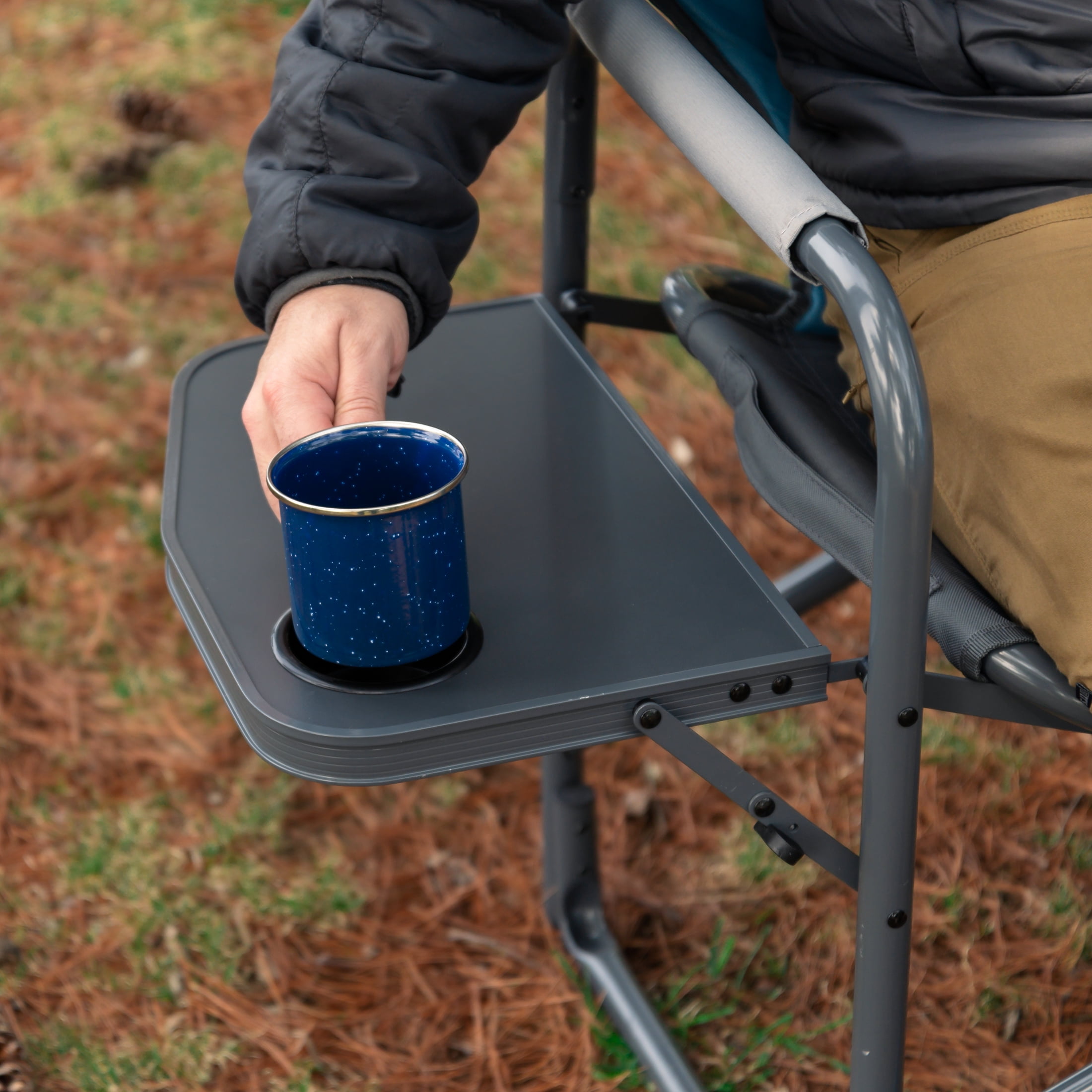 $115.21Timber Ridge® Director’s Chairs are easy to use, lightweight, and comfortable. The Timber Ridge® chair has a great side table that allows for dining and snacks to be stored on it while eating. We have also incorporated a drink holder for your favorite beverage. The lightweight aluminum frame is both strong and easy to set up, while the durable polyester fabric makes for a comfortable seat and lasts season after season. Keep your drink and your texts close by with the foldout side table, with holders for both to keep your hands free while you relax. Easy fold up to compact size for moving and storage.