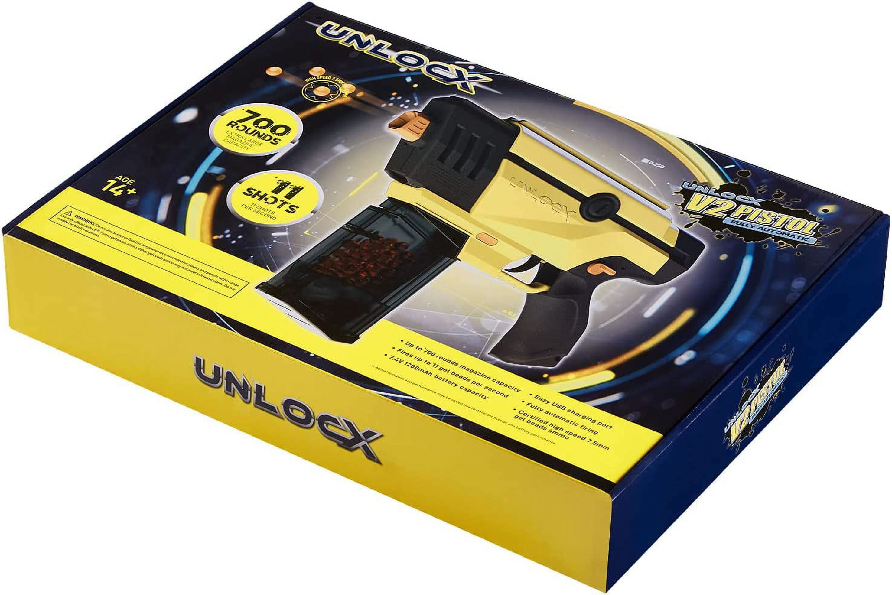 $16.07UnlocX Water Bead Blaster Kit, Fully Automatic Rechargeable Battery Powered 200fps Water Ball Blaster with 3,500 Water Beads, Large Capacity Clip, able to Shoot 11 Rounds per Second, Yellow. The UnlocX shoots up to 11 gel beads per second that can travel up to 100 feet at the fastest-ever velocity of 200 FPS, with just enough minor sting to make the fun and laughters real. Each UnlocX’s magazine holds up to 700 water balls for maximum blasting and extended playtime. With 7.4V 1200mAh powerful rechargeable battery. UnlocX V2 supports 5,000 times blasting after fully charged. UnlocX unique powerful engine ensures 100% stability of your performance. Best gift for teenagers 14 +