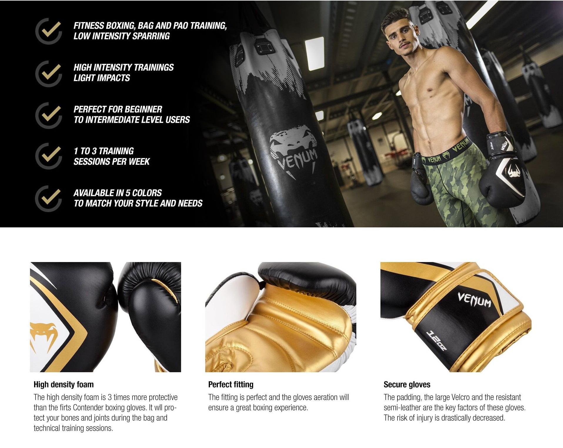 Venum PU Contender 2.0 Boxing Gloves – Black/Gold – 12oz – Unisex – Sparring and Bag Training