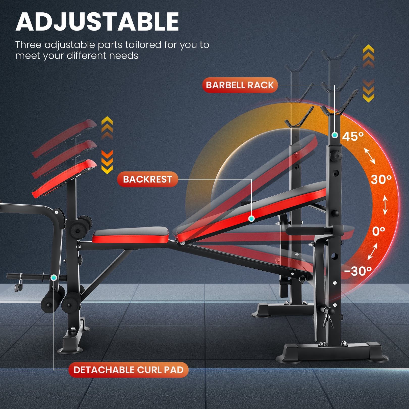 VIBESPARK Adjustable Weight Bench Set 6 in 1 Bench Press Workout Bench with Barbell Rack Removable Foot Bracket, Pairs of Resistance Bands for Home Gym Training