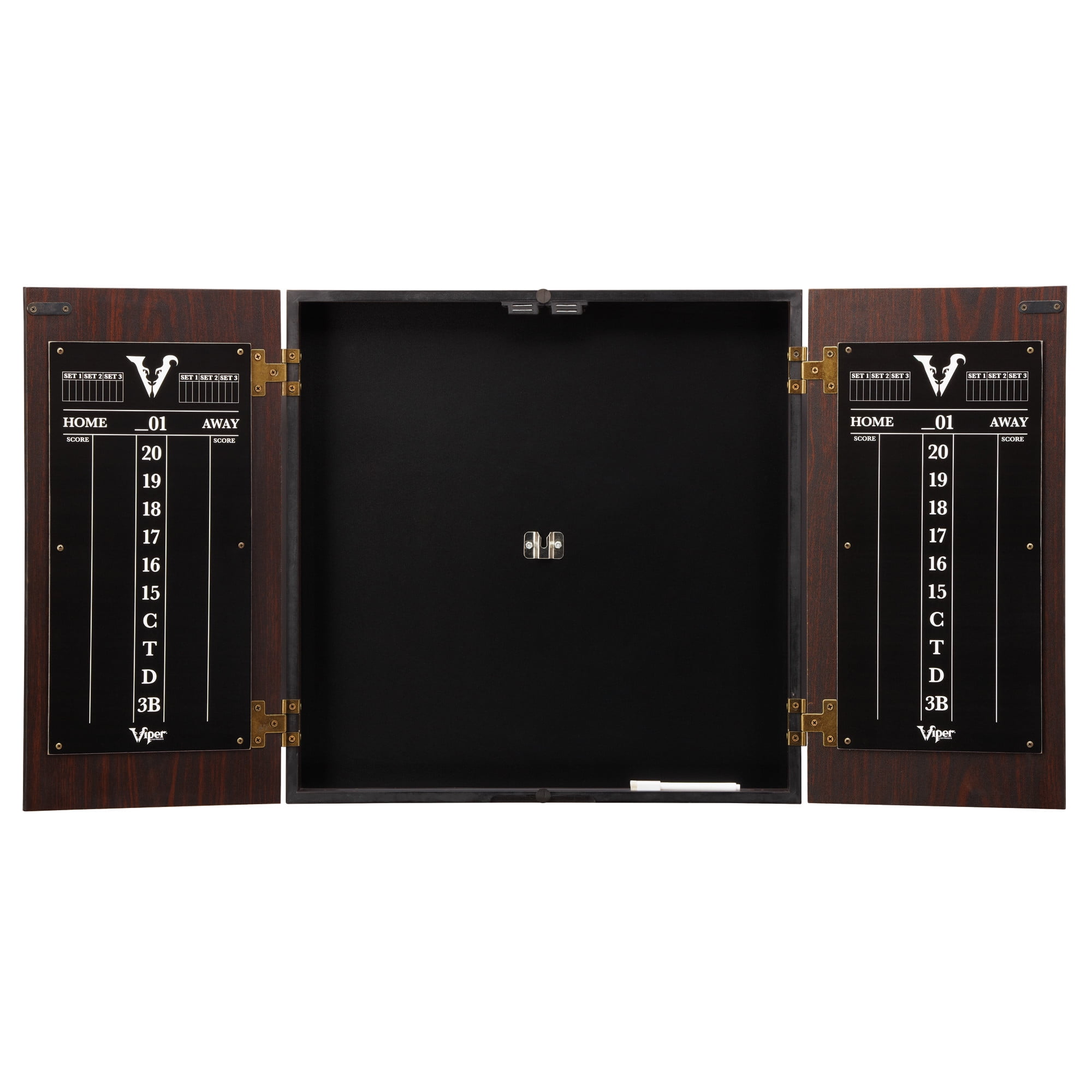 $99.75Your reign starts now! Introducing the Viper Stadium Cabinet with Shot King Sisal Dartboard & “The Bull Starts Here” Throw Line Marker Bundle – the bundle every King or Queen of Darts needs in their royal treasury! The Shot King is Tournament Quality Regulation 17.75″ in diameter and made from compressed sisal fibers, granting it substantial longevity in comparison to older, wood-based boards. This is due to the material’s “self-healing” nature: the sisal fibers automatically close the holes left behind by your darts, essentially returning the board to its original state whenever a dart is removed. You can also rotate the detachable number ring around the board, allowing your prime spots to move to a new section when the previous ones wear down. Its staple-free bullseye and rounded, galvanized steel wire spider also significantly decrease your odds of bouncing out upon impact, and if you want to get started right away, six starter darts are included to let you shoot first and ask questions later. Meanwhile, the Stadium Cabinet containing the board is constructed from wood and given a smooth walnut finish. Its doors feature brass-finished patina bronze hinges, built-in dry erase scoreboards, and a magnetic lock to keep the cabinet firmly shut when not in use. Darts and other accessories can be stored in the compartment below the board area, and a mounting bracket installed for you in the center of the cabinet makes hanging up your Shot King a breeze. Rounding out the bundle is a standard throw line marker that’s easily applied to any floor.