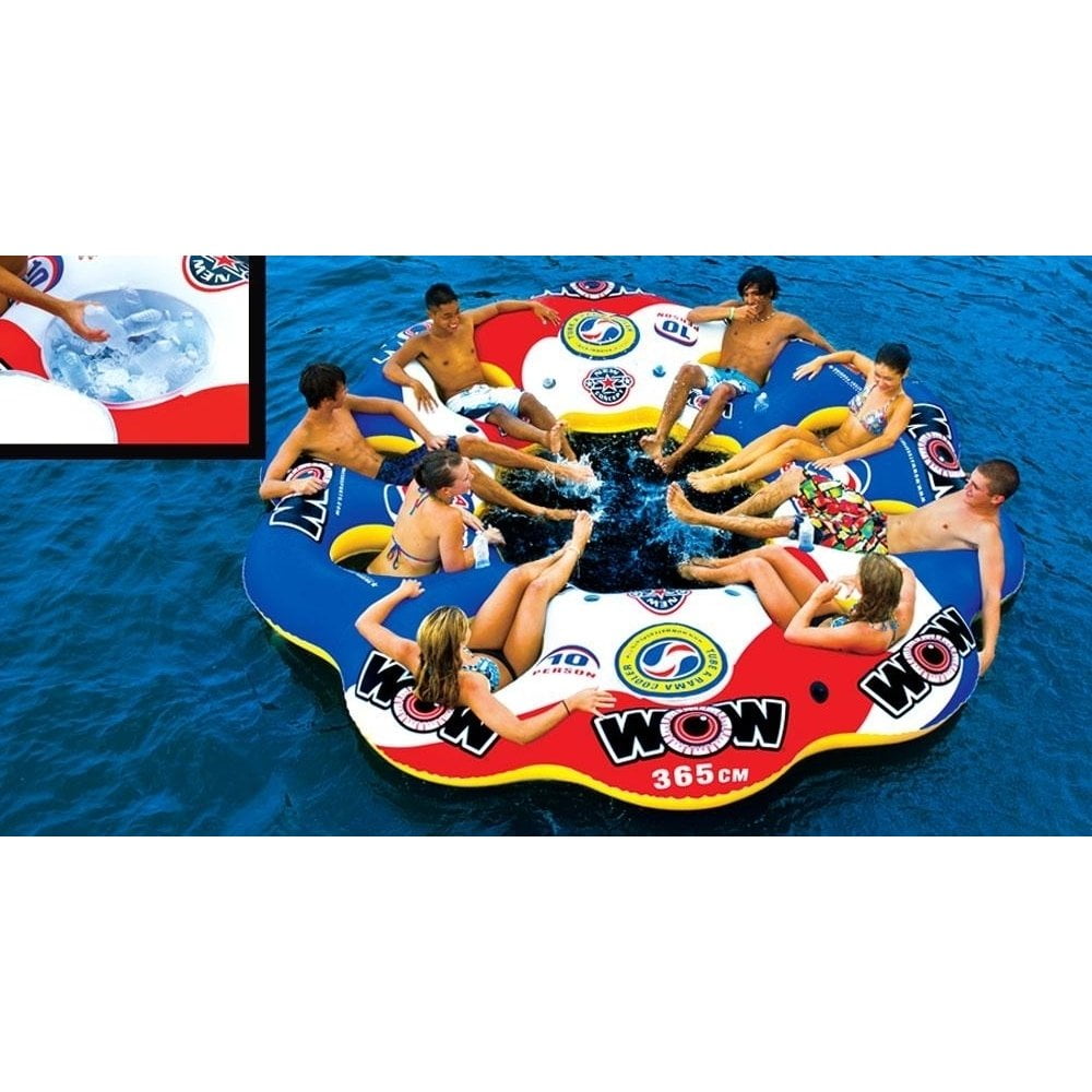 $424.83Original price was: $424.83.$326.79Current price is: $326.79.It’s party time with the HUGE new island from WOW. This huge 12ft. diameter island is great for parties at the lake. Room for up to 10 people, this island was designed with 8 tubes around the diameter, 4 with mesh and 4 without for added play value. There is also a large mesh central deck for relaxing in as well. And for added convenience we have designed 2 Large BUILT-IN coolers for keeping your favorite beverages cold on a hot day. The island also comes with 8 recessed cup holders. Fun for the kids and adults, the colorful Red, White, and Blue graphic design will be sure to draw attention and get your party started. Made from 100% Heavy-Duty PVC material.