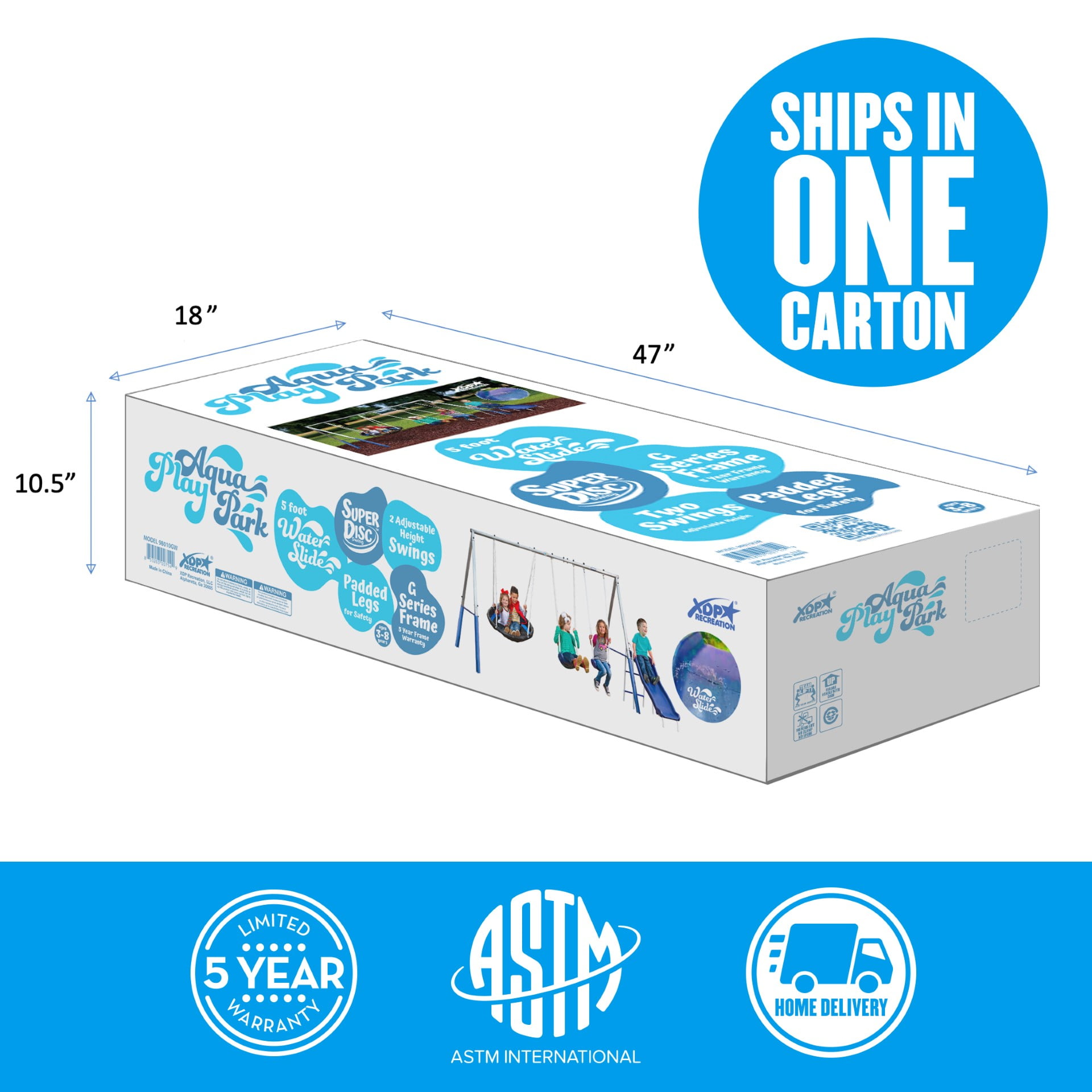 $180.59XDP Recreation, one of the most popular brands in the market, introduces our New AQUA PLAY PARK with Water Slide (Patent Pending). This swing set is part of our NEW G-series™ Galvanized steel tubing swing sets with 2-inch, thick Galvanized steel tubing for durability. The Set includes 2 Swing Seats with vinyl-covered adjustable height chains for safety, a Super Disc™ Saucer Swing for 2 kids with padding, and a 5′ blow-molded Water Wave Slide (Patent Pending) with a safe landing zone. Up to 5 children can play at once on the swing set. Your children will have hours of fun day or night! Safety is important; all our products meet or exceed ASTM safety standards.