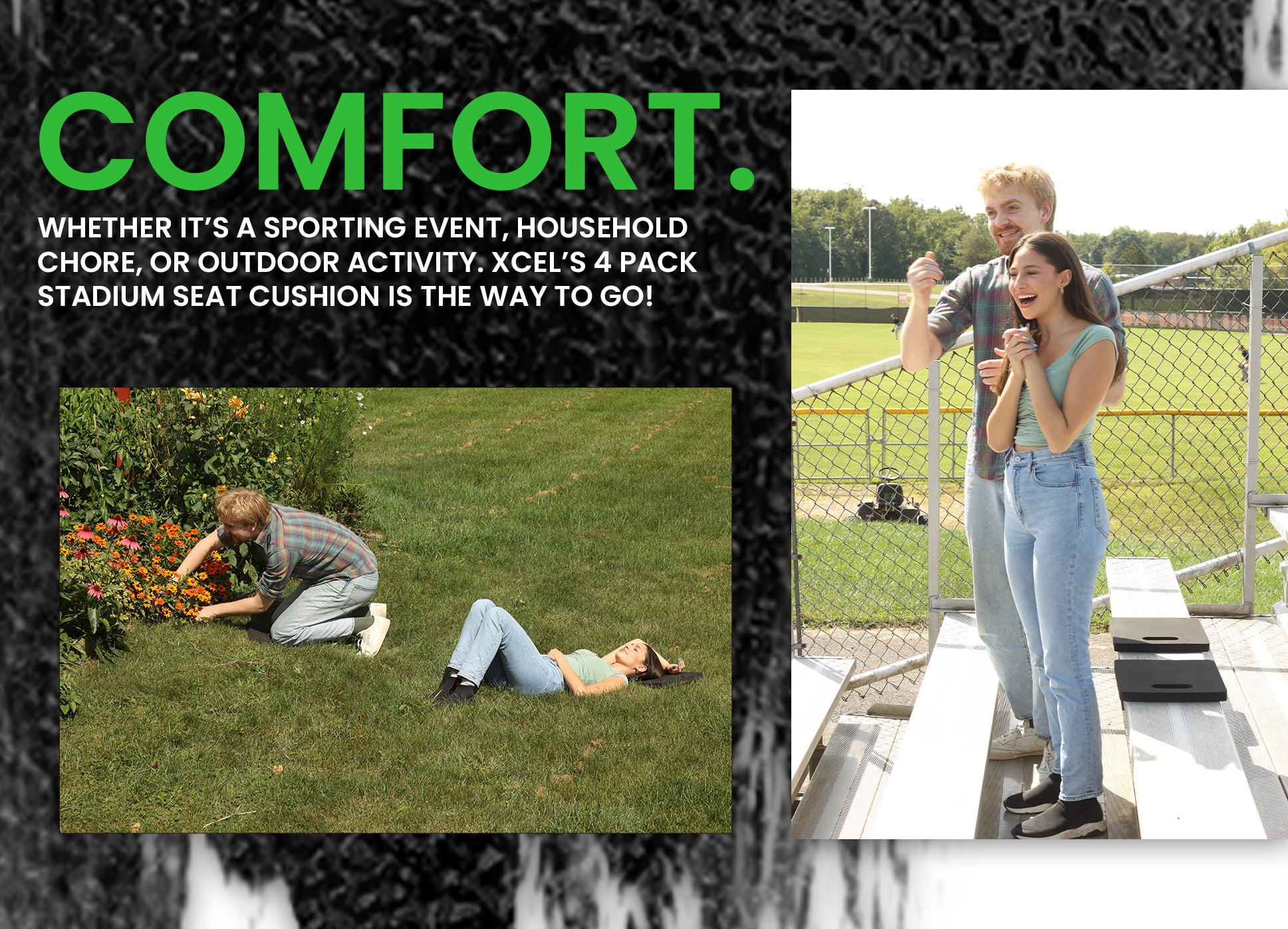 XCEL Portable Stadium Seat Pad Cushions 4 Pack – Foam Rubber Bleacher Cushion Seat Pads for Spectating Sports, Festivals, Outdoor Seating, Yoga – Water Resistant – 14 x 12 x 1 inch Thick – USA Made