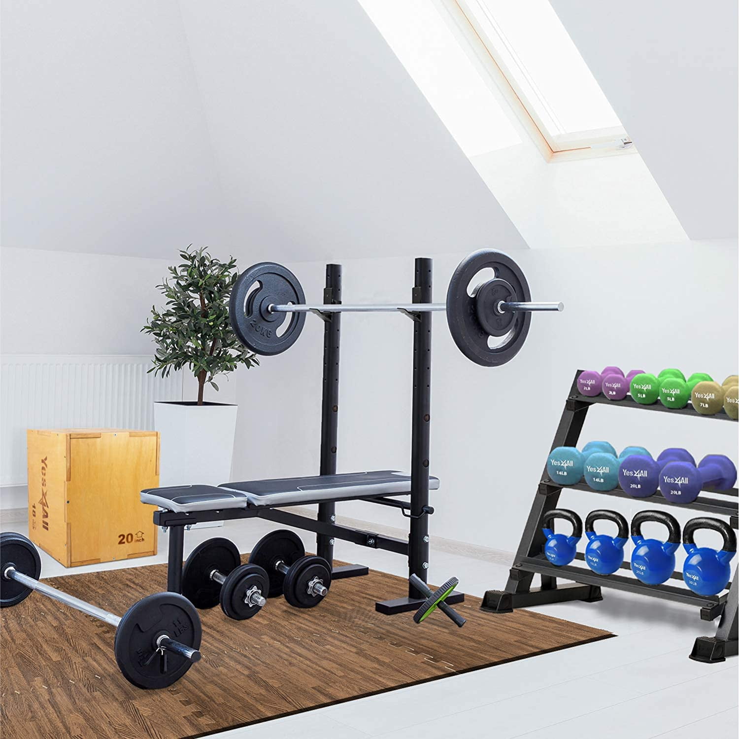 $34.25YES4ALL INTERLOCKING EXERCISE MAT If you intend to turn your bedroom into home gym, get Yes4All Interlocking Exercise Mat and see how it works magic to your room. This all-in-one floor mat will protect your floor from damage while providing a comfortable workout area. This exercise mat is perfect for home gym, gyms, Aerobic, Yoga, Pilates, Cross fit, swimming pool edges and can also serve as sleeping pad for camping, or soft padded children playground mat on a hard floor. PROFESSIONAL QUALITY-CLEVER DESIGN Yes4All Interlocking Exercise mat is made of high density EVA foam which provides a soft, durable, and shock-absorbing surface for your best experience when exercising or playing with your children. Plus, the EVA foam mat is grippy enough to ensure a non-slip workout surface. With ½ inch extra thick, the exercise mat is comfortable on your knees, elbows, spine and hips during practice. With a waterproof design, our mat is easy to clean and works well in wet places like swimming pool edges. These puzzle pieces are lightweight, easy to resemble, remove and carry outside for cleaning. It can also be cut to fit customized workout areas. : 60 day Free Return and 2 Year . 12 TILES COVER 48 SQ. FT: Include 12 tiles. Each tile measures 24”L x 24”W x 7/16”thick – Thick from the highest point of the texture DURABLE & NON SLIP: The non-skid textured & shock-absorbing surface provides a soft feeling when exercising on, best for comfortable workout area – a combination of high-density EVA foam mat & exercise mat for excellent support and cushion EASY 5 MINUTE ASSEMBLY: Lightweight puzzle pieces can be connected and disassembled easily in less than 5 minutes. Great for home gym, fitness gym, garages coverage or children’s play areas PROTECTIVE WORKOUT FLOORING: Give yourself shock-absorbing comfort when doing Yoga, Pilates, CrossFit or weightlifting. Yes4All Interlocking Mats can also be used to create a soft & anti-slip floor while camping or playing EASY TO CLEAN: The water-resistant & noise-reducing design is easy to clean. The moisture-resistant technology & high-quality material make the mat easy to wash with soap & water