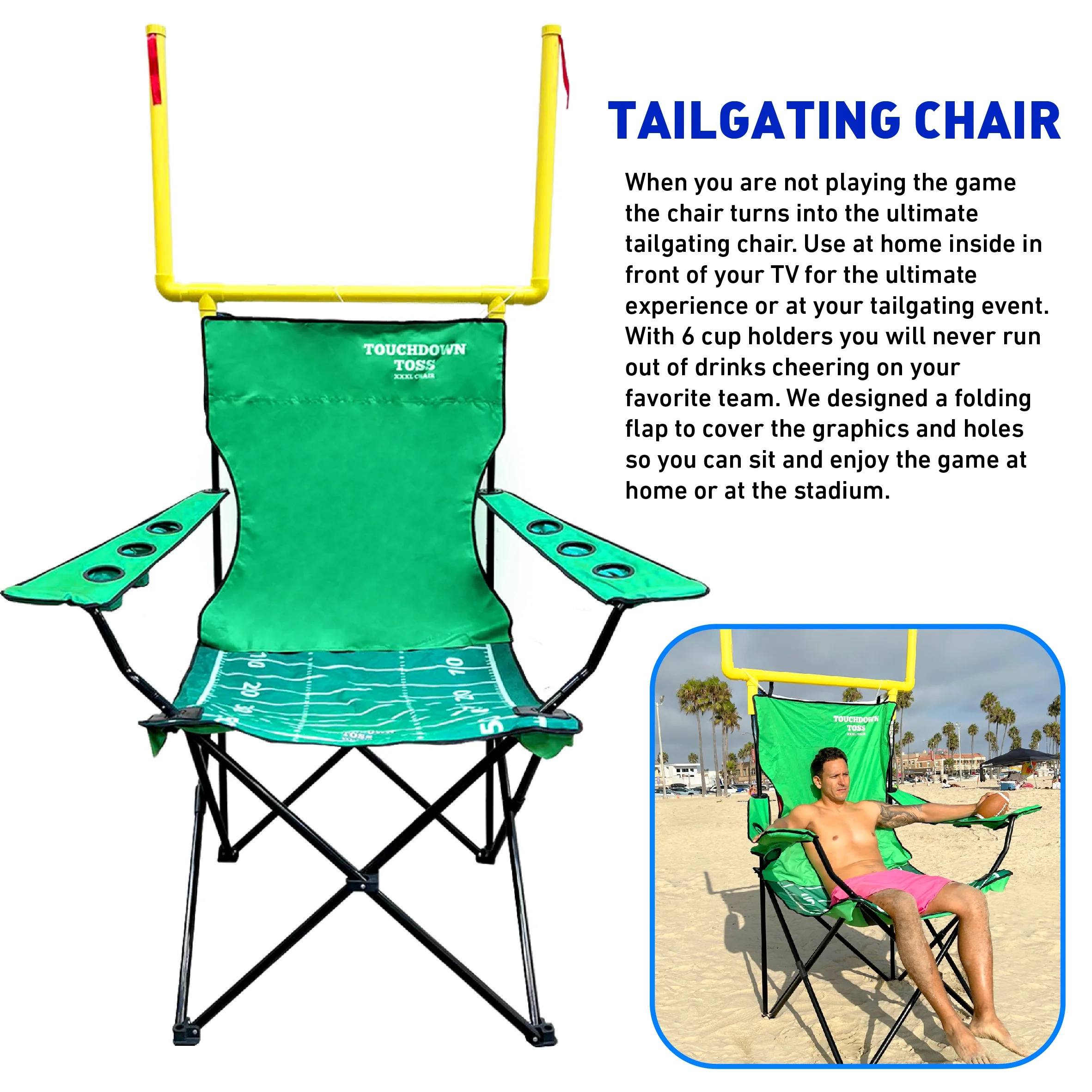 $146.19Full color graphics and large size make this the ultimate football toss game. Challenge your friends to the funnest football toss on the planet. Keep score like cornhole and then you MUST kick a field goal to win at the end. Play with 2 or 4 players or just practice by yourself. Game instructions are included in the package. Every football fan loves this game. Large backrest of chair blocks badly thrown balls so no running around all the time collecting the footballs. When you are not playing the game the chair turns into the ultimate tailgating chair. Use at home inside in front of your TV for the ultimate experience. With 6 cup holders you will never run out of drinks cheering on your favorite team. We designed a folding flap to cover the graphics and holes so you can sit and enjoy the game at home or at the stadium. We made this chair as GIANT as we could. The chair with goal posts are just under 8 foot tall with the field goal poles installed. Giant chair folds into portable storage bag to be able to move around easy. Footballs and accessories are stored in separate storage bag so you don’t lose any items in transport. This chair grabs attention and creates excitement at tailgate events and parties. Send your friends pictures of you sitting in your chair with goal posts in front of your TV at home too. Giant chair folds open just like a conventional folding chair – Accessories are included and easy to install the goal posts in just minutes and you are ready to play. Fold down back flap and use as the ultimate tailgating chair. Taking down the game takes just minutes and can fit into car or truck easily.