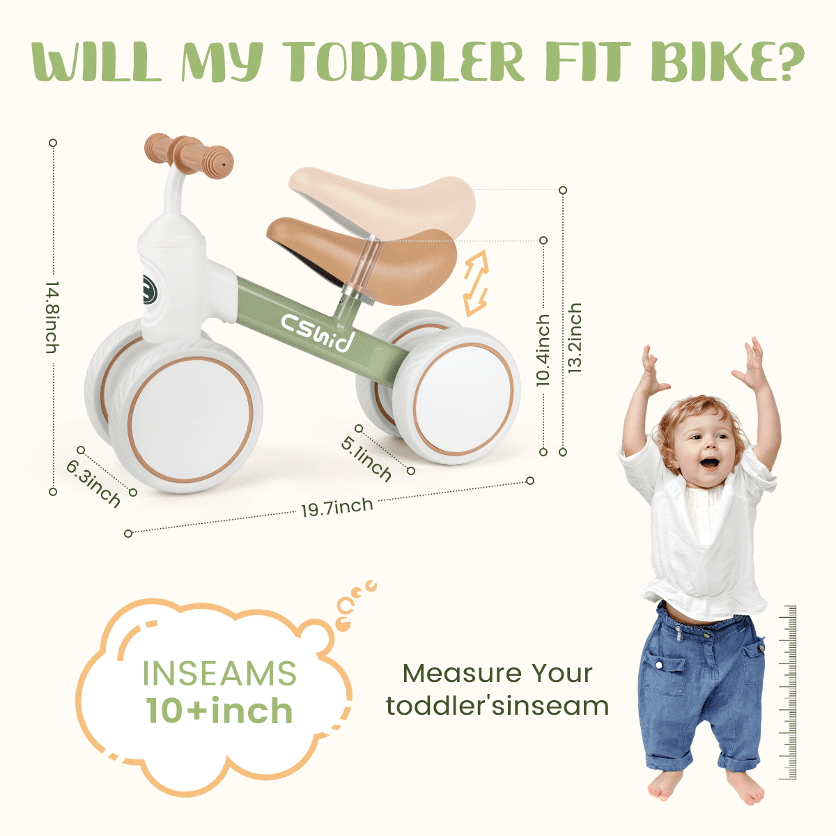 $51.59Original price was: $51.59.$28.37Current price is: $28.37.Cshidworld Toddler Balance Bike is suitable for indoor and outdoor riding. It keeps kids happy riding even on carpet. It’s a Great gift for toddlers to learn to walk and ride. Can help enhance the baby’s balance, steering, coordination, and increase self-confidence. Start your adventure riding this kids balance bike! Features: ✅ Design for 12-24 Months Babies ✅ Carbon Steel Frame, Sturdy Constrction ✅ Adjustable Seat, 10.4in to 13.2in ✅ PU Soft Seat ✅ 135° Steering Limiter Design ✅ Non-slip EVA Widened Tires ✅ Maximum Weight Capacity 66lbs ✅ Light Weight, Only 3.5lbs ✅ Easy to Assemble ✅ Suitable for Indoor and Outdoor Use ✅ Enhance the baby’s balance, steering, coordination, and increase self-confidence Sturdy Carbon Steel Frame The carbon steel Frame is lighter and stronger, weighing only 1.5 kg (3.3 lbs), making it easy for your baby to ride and stride. EVA wheels are quiet and non-slip for indoor and outdoor riding. TPU handlebars prevent hands from falling off the handlebars. The low-resistance bearings save more effort when riding. Adjustable Seat & 135° Steering Limit The soft and adjustable PU seat allows the kid to ride in a comfortable position. Non-slip handlebars and 135-degree steering settings prevents them from turning too far and falling to the side while still on their bike. The left and right steering wheels do not leave the ground to steer by gravity, which effectively exercises the balance ability.