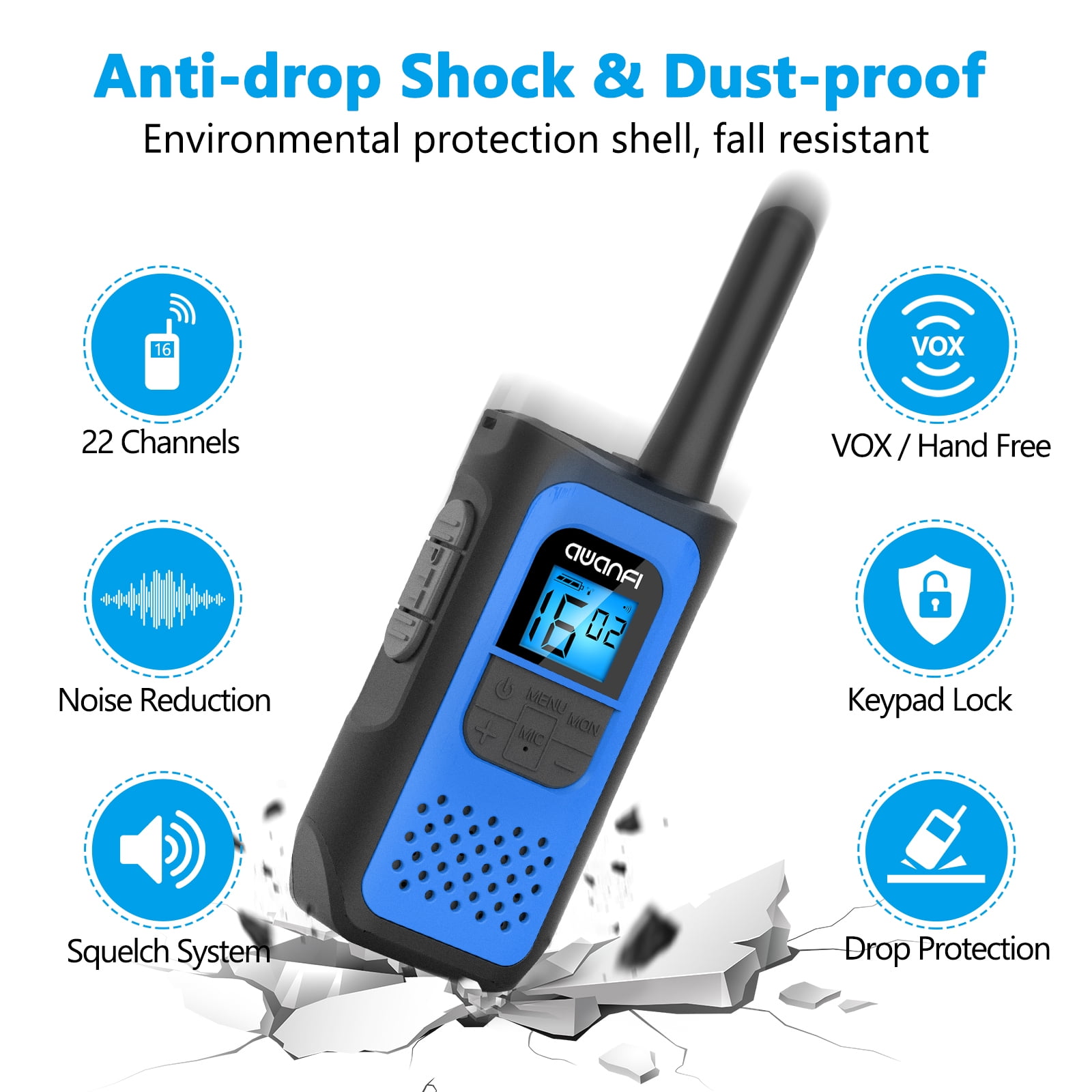 $77.39Original price was: $77.39.$42.99Current price is: $42.99.AWANFI Walkie Talkies for Adults 4 Pack Rechargeable 22 Channel Long Range Two Way Radio The AWANFI FRS Long Range Walkie Talkie 4 Pack provides hands-free operation. It includes four AWANFI Long Range Walkie Talkies that feature an up to 3-mile communication range in open fields and 22 channels. Keep your communications private with 121 privacy codes and keep chatter off of your channel with these rechargeable walkie talkies. It comes with Micro USB Cables and belt clips. If you are looking for an affordable and fun way to communicate with your crew in a gig or event or just to play with your family. AWANFI Walkie Talkie 4 Pack will be a great choice! Features: Rechargeable Walkie Talkies: Equipped with a 1200mAh rechargeable Li-ion battery, this walkie talkie can literally help you to save a lot with no more extra expense on non-rechargeable AA batteries. Multiple Charging Methods: You can recharge the walkie talkie via the upgraded USB-C port in various ways like a power bank, car charging and a 5V USB charger. The walkie-talkie can have 3-4 days standby time after being fully charged. Complete Features: This walkie talkie with sturdy material can provide very useful features, such as VOX (auto voice trigger), auto channel scan, auto channel memory, power save function. Low battery warning, keypad lock and busy channel lock, automatic squelch, etc. Easy to Use: The AWANFI walkie talkie 4 pack is compact and lightweight with a large backlit LCD screen, and can be easily used by children, adults and the elderly. It will also be suitable for a variety of outdoor and indoor activities, for example cycling, camping, hiking and adventure play.