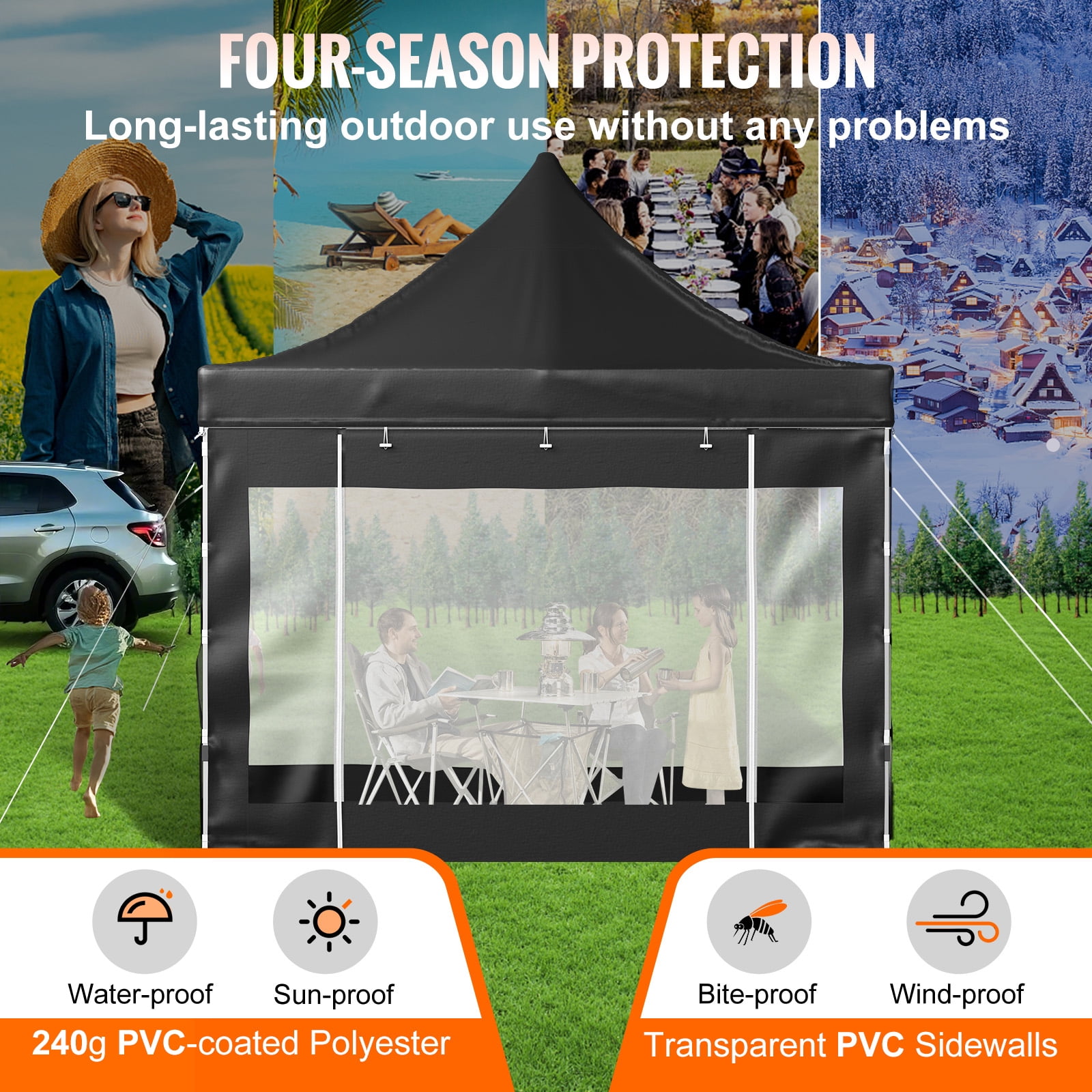 10 x 10 FT Pop up Gazebo TentAdjustable Height & Pop-up Design & Easy to StoreThe Quality You Can SeeThe tent top is made of 240g PVC-coated polyester, and the removable sidewalls are made of thick PVC. Both high-quality materials will make the tent look good as new for years to come and ensure long-time use outdoors.Multiple ProtectionsThe instant gazebo shelter can protect you from rain, snow, and sun during all seasons. The transparent sidewalls allow you to see outside clearly while keeping out the wind and rain.Convenient Height AdjustmentUsing the Upgraded button, you can easily adjust the height from 9.7ft to 10.3ft by gently pulling the button outwards. Three different heights allow you to choose the right height for your needs.All-purpose 3 in 1 Gazebo TentThe side walls are detachable, so you can build different tents according to your needs. For example, detach all the side walls and the door, or install the sidewalls. Just open the door or fully close it.Take it AnywhereTo facilitate usage and storage, we provide a free wheeled carry bag, so you can store and take it out conveniently. Place the tent in the bag, put it in your car trunk, and travel anywhere you want.Broad ApplicationsThe pop-up gazebo tent with sidewalls provides approximately 100 sq. ft of space for 6-7 people. It is essential for outdoor parties, weddings, or other commercial activities.Specifications