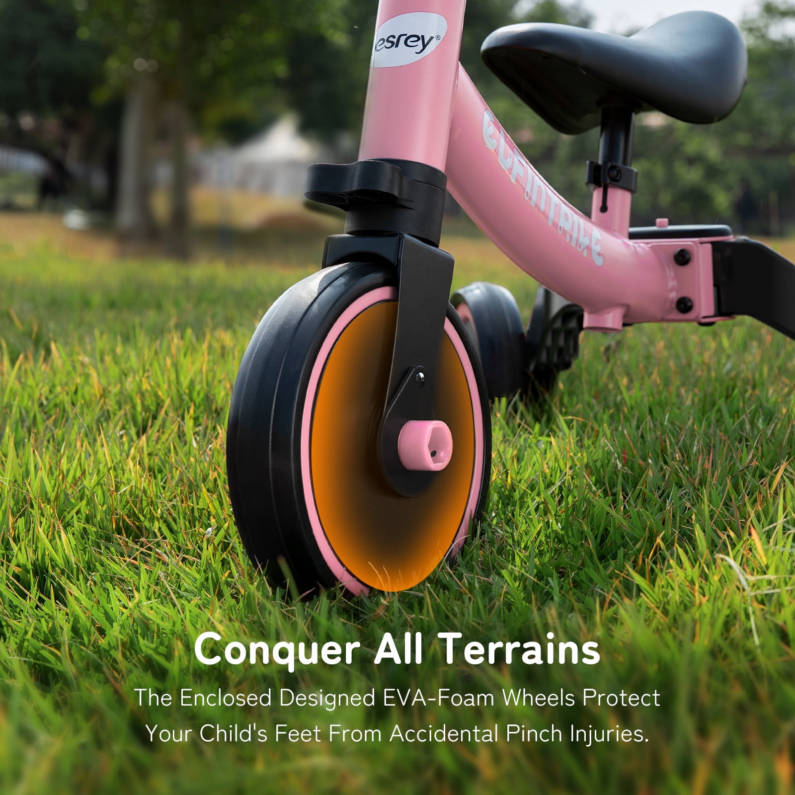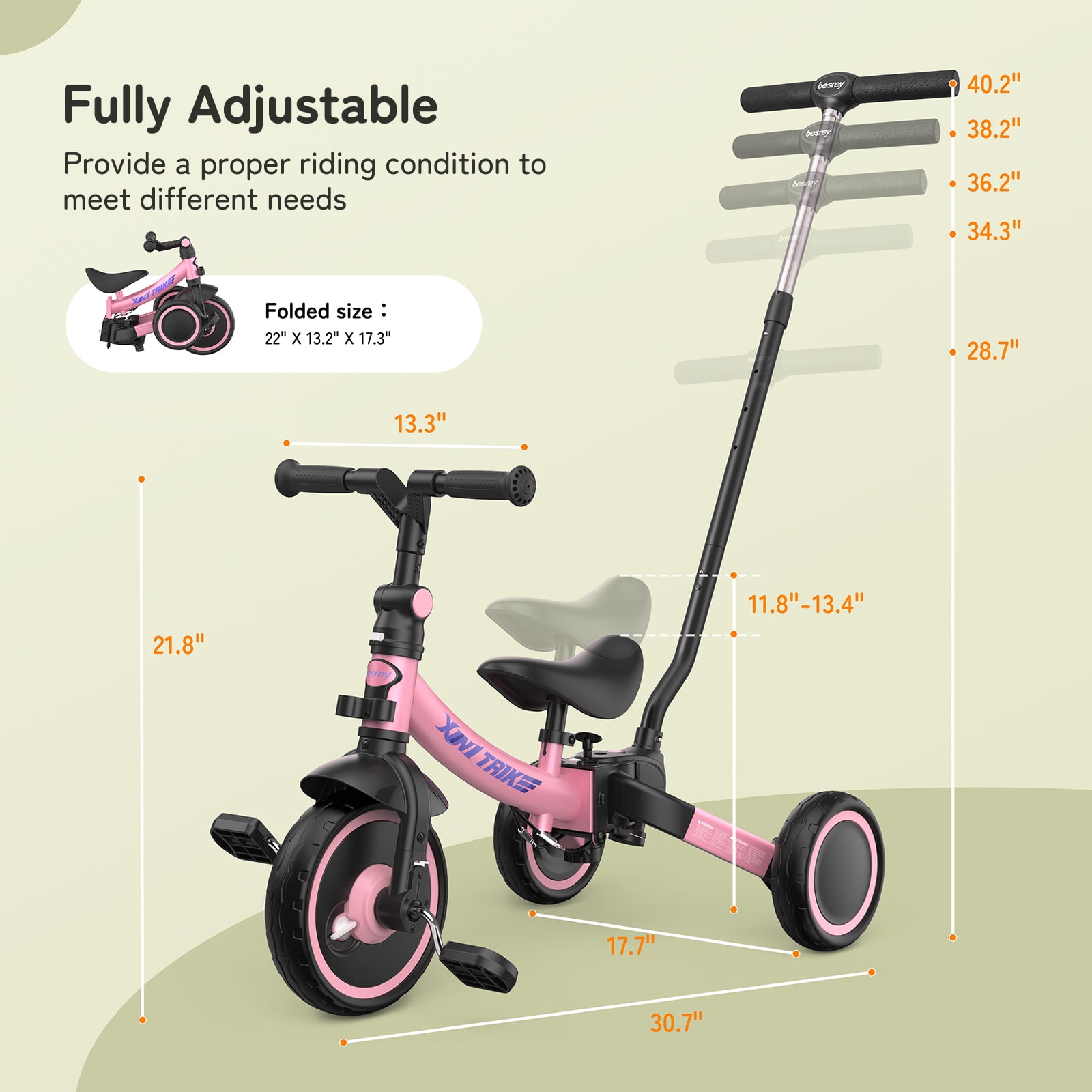 $42.79With a high-quality and safe design, Besrey 5 in 1 Toddler Tricycle has been certified of ASTM F963-17 and CE, which has a simple, unisex, but lovely look. Come and enjoy the fun of selecting colors for your baby, we have 5 colors available now! When designing this kids trike, we specially adopted a curved carbon steel frame structure, which plays the role of buffering vibration and shock absorption to better protect your baby’s joints. And the design without edges can minimize the risk of being hurt from riding, so that your baby can play happily while you can be more at ease. Besides, the adjustable handlebar and seat, maintenance-free EVA foam wheels, detachable pedals and footrest, all ensure a comfortable and safe ride.