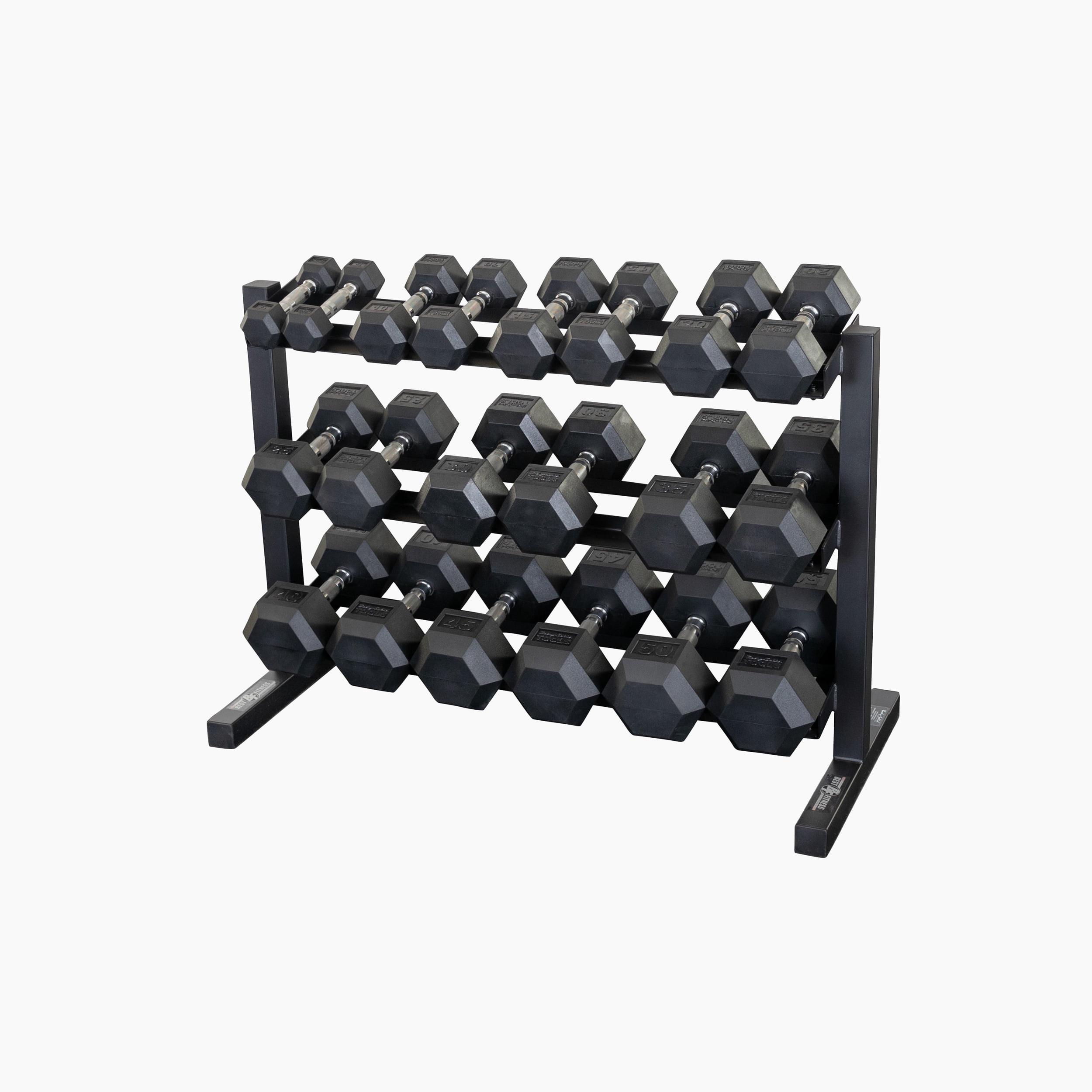 $111.80The Best Fitness BFDR10 Dumbbell Rack is a sturdy, space-efficient and stable rack designed to keep workout areas clean, organized and safe. This three-tier dumbbell rack stores 10 pairs of hex dumbbells between 5-50 lbs. Featuring a durable powder-coat finish, the BFDR10 will stay scratch-free even in heavy use.