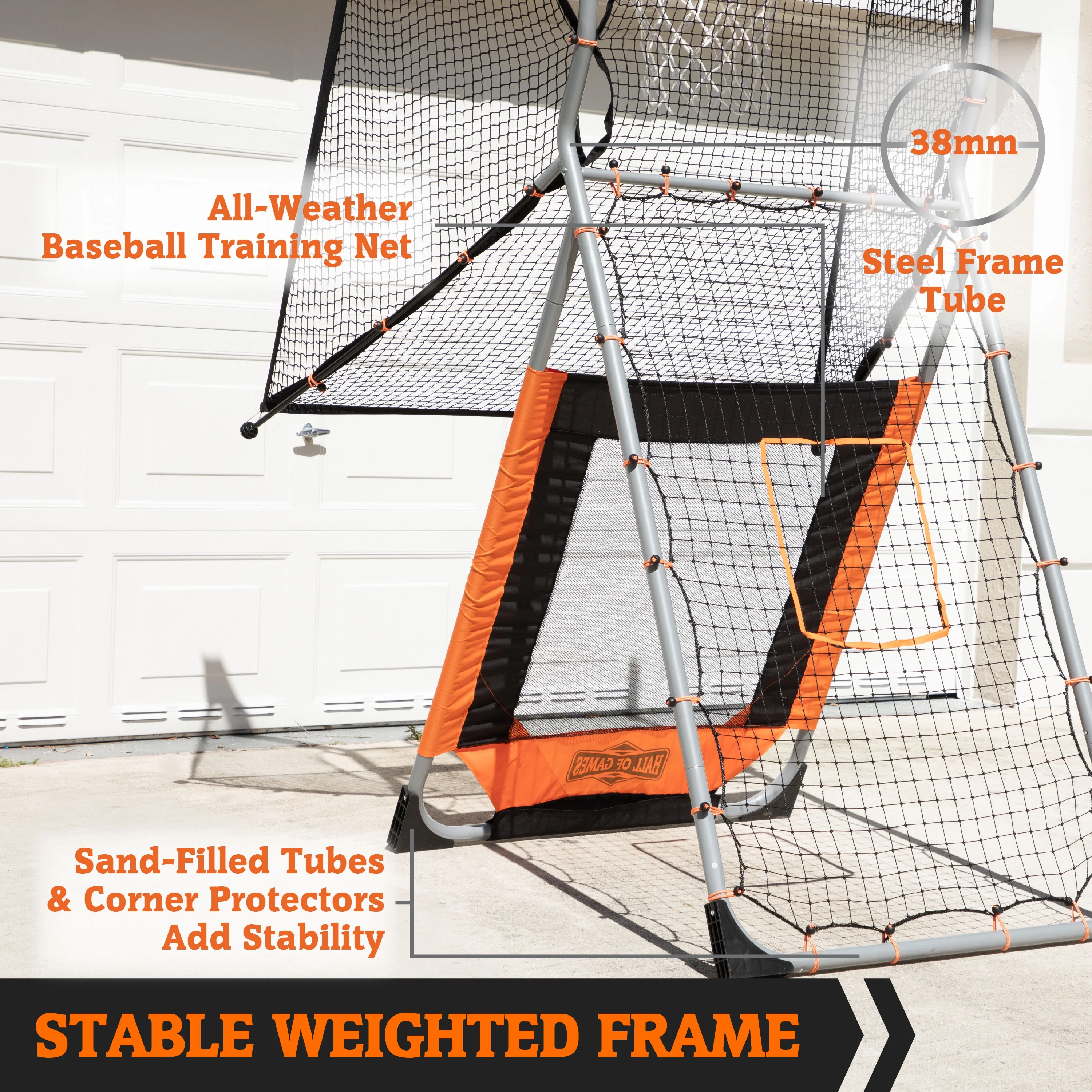 $325.52Hall of Games Outdoor Combo 2-in-1 Basketball and Baseball Training Game is 62″ L x 64″ W x 100″ H in size and perfect for shooting hoops on one side and practicing baseball fielding on the other side. The ball return net will take care of your rebounds so you can spend more time working on your basketball shots. You can use the included measuring rope, and crayon to improve your game by marking a throwing line. The all-weather baseball net will help you improve your throwing and fielding skills with reliable consistent rebounds from the tight heavy-duty net on the opposite side of the basketball game. The 38mm steel tube frame of this outdoor 2-in-1 game has pre-filled sand tubes, and corner protectors to help keep the nets and hoop of this game set on the ground and stable during active play outside. The 18” diameter steel basketball rim is supported by the steel frame and clear polycarbonate backboard of this 2-in-1 game set, and the all-weather netting with thick easy-to-connect bungee cords can withstand training season after season so you can play and improve your basketball and baseball game outdoors and around your home.