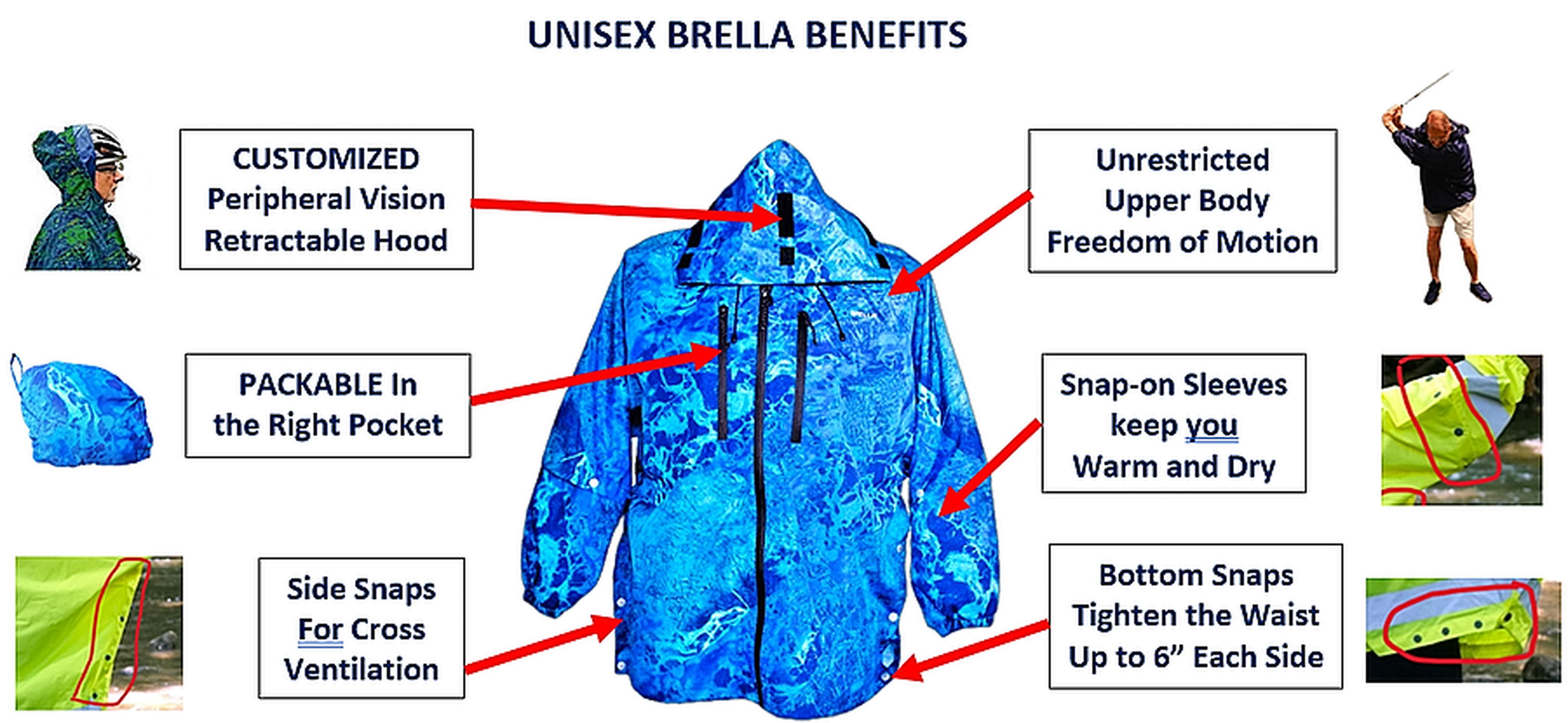 $85.14Original price was: $85.14.$67.94Current price is: $67.94.The Brella 2020 Black unisex, one size fits most rain poncho with snap-on sleeves will keep you dry and comfortable for hours in the rain. The 20,000mm waterproof and 20,000MVT breathable polyester has fully taped waterproof seams, a cross venting system (just unsnap the side snaps and the heat escapes), snap-on sleeves which allow the user to remain warmer with them on, or cooler with them off. The Brella can be worn as a windbreaker and used standalone in warm climates or as the final layer in cooler climates, keeping you and whatever you are wearing dry. The patented retractable hood retracts back 1-4” for customized peripheral vision and safety, a feature liked by many women. There’s a drawcord adjuster with elastic rope closure, heavy-duty YKK waterproof front zipper with outer and inner storm flaps, 2 outside pockets with YKK waterproof zipper closures, packable in the pocket with 2 way YKK zipper and loop for hanging, back length 30 in., imported and machine washable in cold water with a mild detergent and hang dry is suggested. The multi-use Brella is ideal for fishing, camping, kayaking, hiking, hunting, gardening, watching your kid’s soccer games, snowboarding or just keeping dry in the rain.