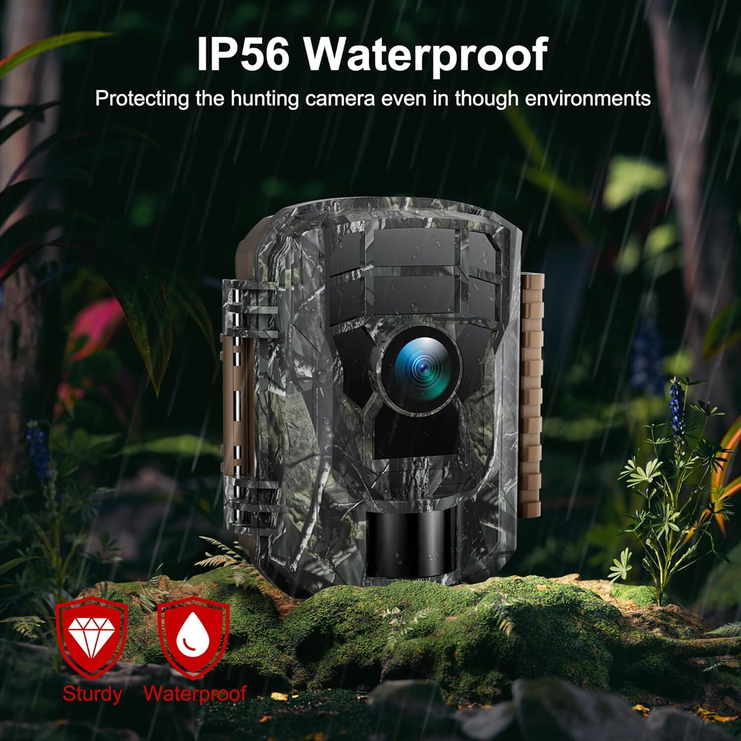 Hunting game camera with 2 pieces High Power 850 nm LEDs support super clear night vision, which can deliver ultra-clear and detailed night vision, letting you catch any moment at dark night. Trail camera with IP66 waterproof camera body design, the hunting game camera has waterproof rubber ring and weatherproof casing.