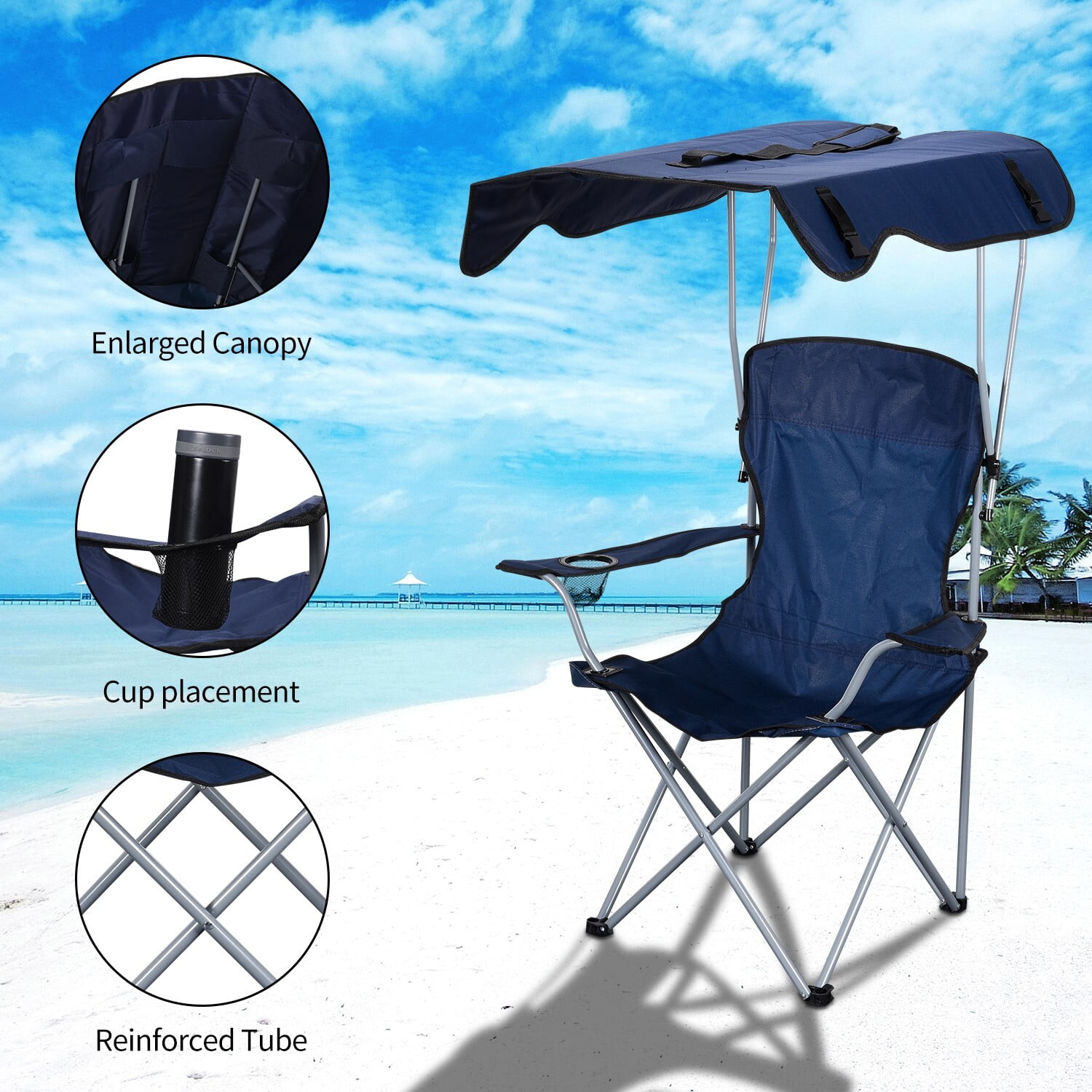 Camping Chair with Shade, Foldable Shade Beach Chair with Cup Holder for Outdoor, Camping, Beach and Patio (Blue)
