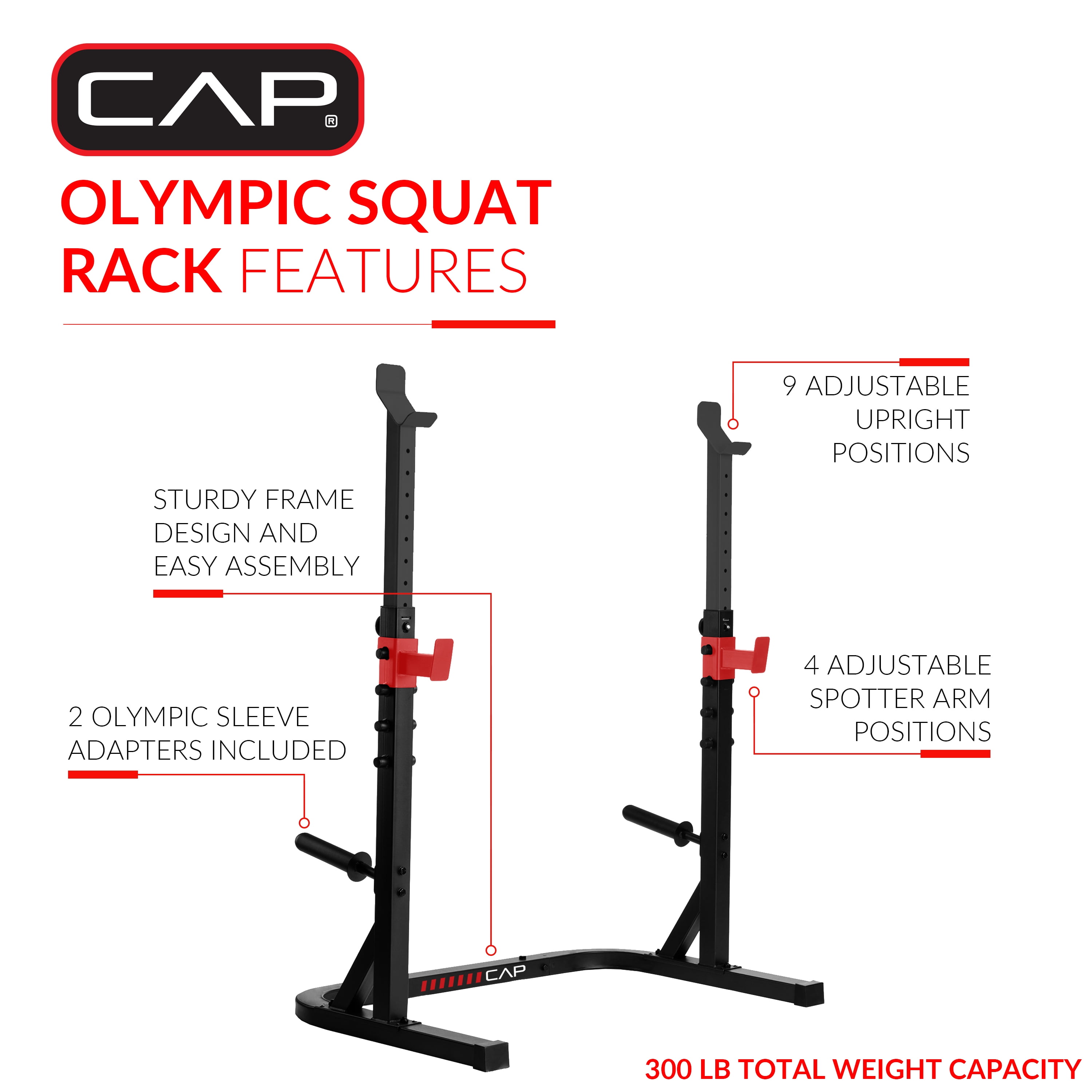 $85.14Step up your strength training routine with the CAP Adjustable Olympic Squat Rack, which allows you to target thigh, hamstring and lower back muscle groups, along with targeting the upper body. This durable Olympic rack is built with heavy-duty steel construction and a powder-finish to prevent rust, making it a great addition to any home gym. Use just the rack to Perform traditional squats, rack pulls and deadlifts to targeting the lower body or add a weight bench (sold separately) to use the rack to perform chest presses and a variety of other combination exercises. Customize the uprights and safety catches (Spotting Arms) to your specifics making it comfortable and secure when performing squats or lunges. Featuring two plate-posts that hold Olympic or Standard plates, this squat rack offers storage space for your weight plates within reach as you work out. Weight a weight capacity of 310-pounds, this squat rack is built to withstand heavy loads.