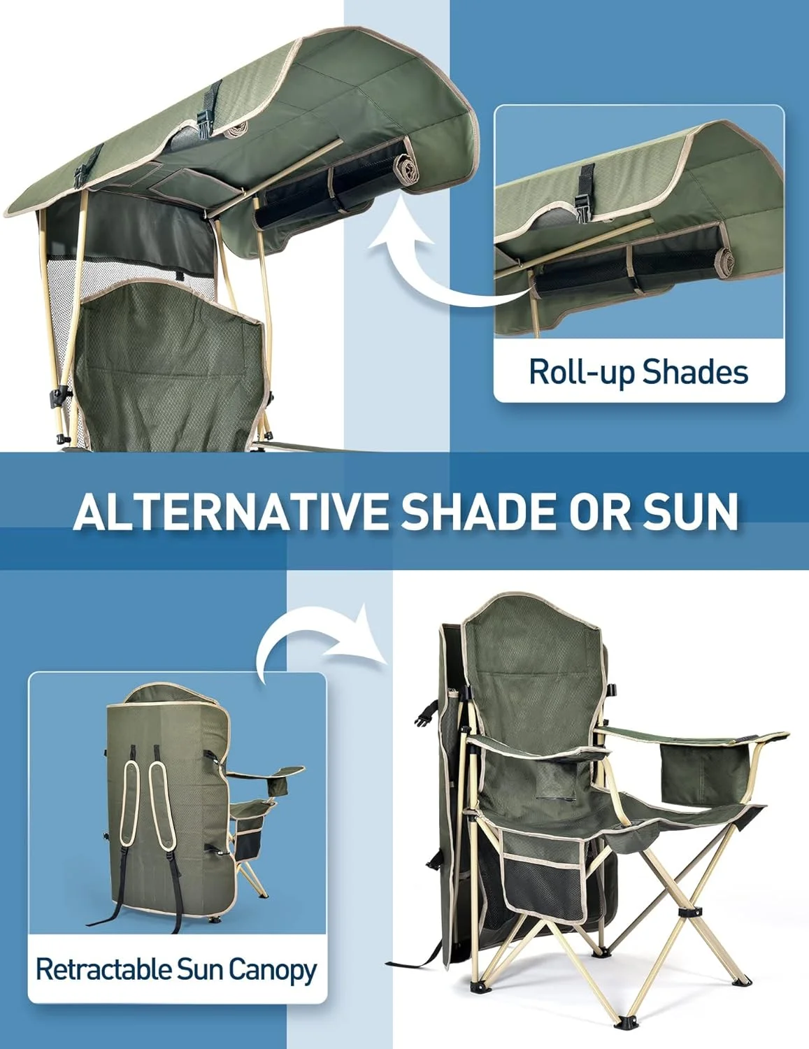 Canopy Camping Chairs with Cooler Pouch, Foldable Beach Chair for Adults with Retractable Shade, Summer Camping Chairs with Cup Holder & Side Pocket for Lawn/Tailgates/Sports- Support 330LBS – Green