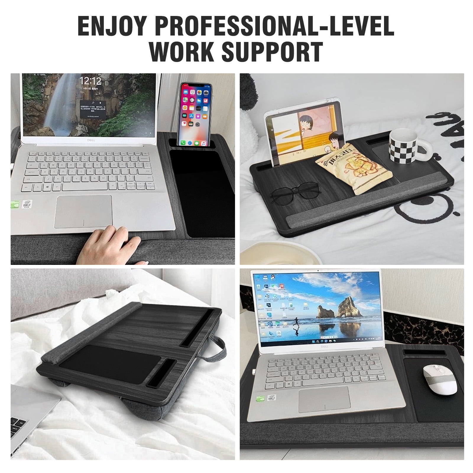 CATGOOD Portable Lap desk, Laptop Desk with Pillow, Wood Lapdesk Bed Table with Soft Pillow, Mouse Pad & iPad/Phone Slots, Fits up to 15.6 inches, Black