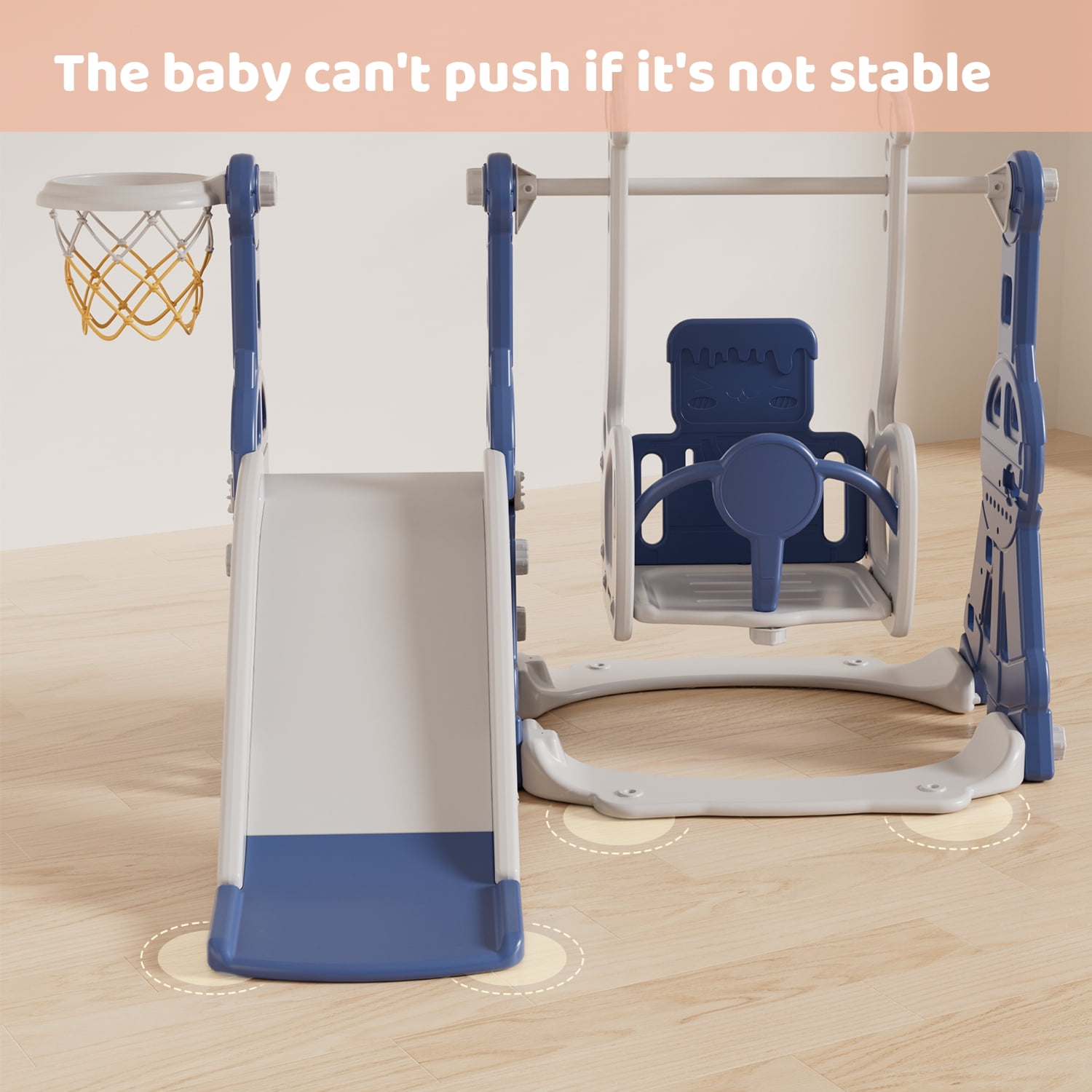 $77.394 in 1 Toddler slide CHAOFEI Toddler Slide is made with durable and safe odor-free HDPE, that is safe for kids to play on and has a weight capacity of up to 110 pounds. Our Kids slide has 4 activity areas, including stairs, slide, shoot a basket area, climbing area at the bottom. It is also perfect for indoor or outdoor use and can be easily assembled and disassembled without the need for any tools. The baby slide features staircase design and wide steps that make it easy for toddlers to climb up and slide down safely. It also has smooth edges and rounded corners that protect todder from injuries while playing. Additionally, the baby slide has a stable base that prevents it from tipping over during playtime. Activities: Shoot a Basketball, Slide Design, Swing Design, Climber Design Specification Color: Blue/Pink Material: HDPE Net Weight: 22 lbs Swing Seat Capacity: 110lbs Slide Capacity: 110lbs Age Range: 1 – 3 years old Dimension: 34.25” x 11.22” x 18.70”(L x W x H) Package includes: 1 x Children slide 1 x Instruction
