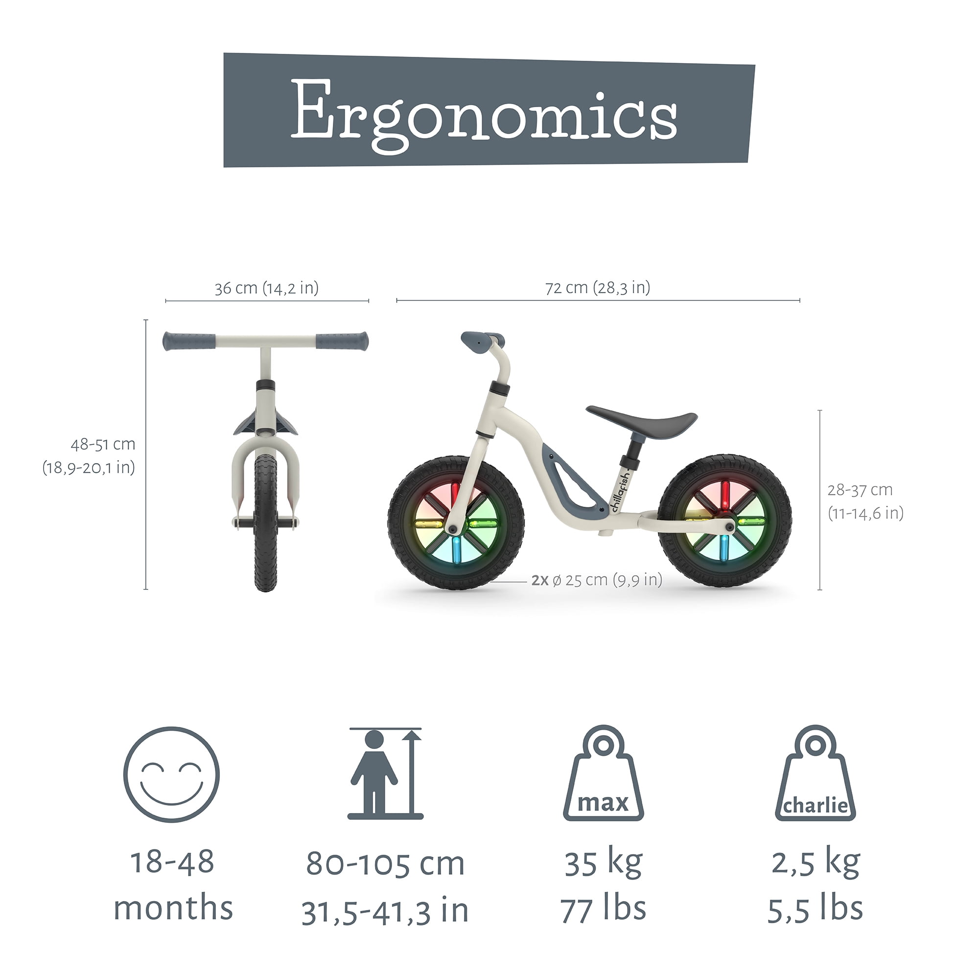 $51.59Chillafish Charlie Glow is a hyper lightweight 10″ balance trainer with integrated light-up wheels when riding for extra fun and visibility. The LED lights in the wheels don’t need any batteries, they are simply powered by riding the Charlie Glow – the faster you go, the harder they glow! This balance bike has puncture-proof tires and a high-quality metal frame weighing only 5,5 lbs / 2,5 kg. The perfect toy to train your toddler gross motor skills, balance and steering. The custom molded comfort seat and handlebar are easily adjustable in height. The seat is adjustable from 11-14,6 inch / 28-37 cm and the handlebar can adjust from 18,9-20,1 inch / 48-51 cm. Thanks to its lightweight frame your toddler can easily control the bike and, in combination with the integrated carry handle, it makes it easy for us parents to carry it as well. The light-up wheels are an extra fun factor and provide extra visibility when riding. The no-puncture 10-inch EVA tires are really comfortable: no need to inflate the tires anymore, no puncture risk, from now on only fun! Charlie Glow comes in 3 stylish colors, so there’s a style for every child. Integrating high-quality design in a very lightweight and intuitive product at very sharp pricing, Charlie Glow for sure is the best value for money balance bike you’ll find. Years of fun and skills to train! Charlie Glow balance bike will teach your kids to ride a real bicycle in no time! Recommended age: 18-48 months Recommended kids height: 31,5-41,3 inch / 80-105 cm