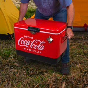 $73.78This lightweight 4 L/4.2 qt mini cooler combines retro ice chest style with modern thermoelectric cooling technology for a fun and functional accessory that holds 6 standard soda cans. It features official Coca-Cola artwork, an eye-catching red exterior, and polished chrome accents, including a secure locking lid, and efficiently cools to 32°F (18°C) below the surrounding temperature with no harmful chemicals or wasted energy..