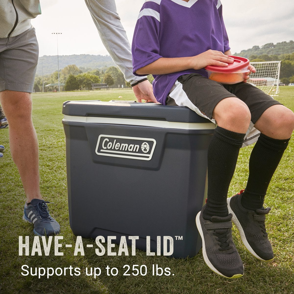 $43.50The Coleman 316 Series 50 QT Wheeled Cooler, 16.6″ W, Blue Nights has a fully insulated lid and body Keeps the Ice™ for up to 4 days in temperatures as high as 90°F, with room enough to fit up to 84 cans The heavy-duty 6-inch wheels and durable telescoping and pocket handles help you haul a full load. Drinks are always within reach and don’t spill because of the cup holders molded to the lid. If more guests swing by the tailgate or picnic, you’ve got an extra seat with the Have-A-Seat™ lid that supports up to 250 lbs.