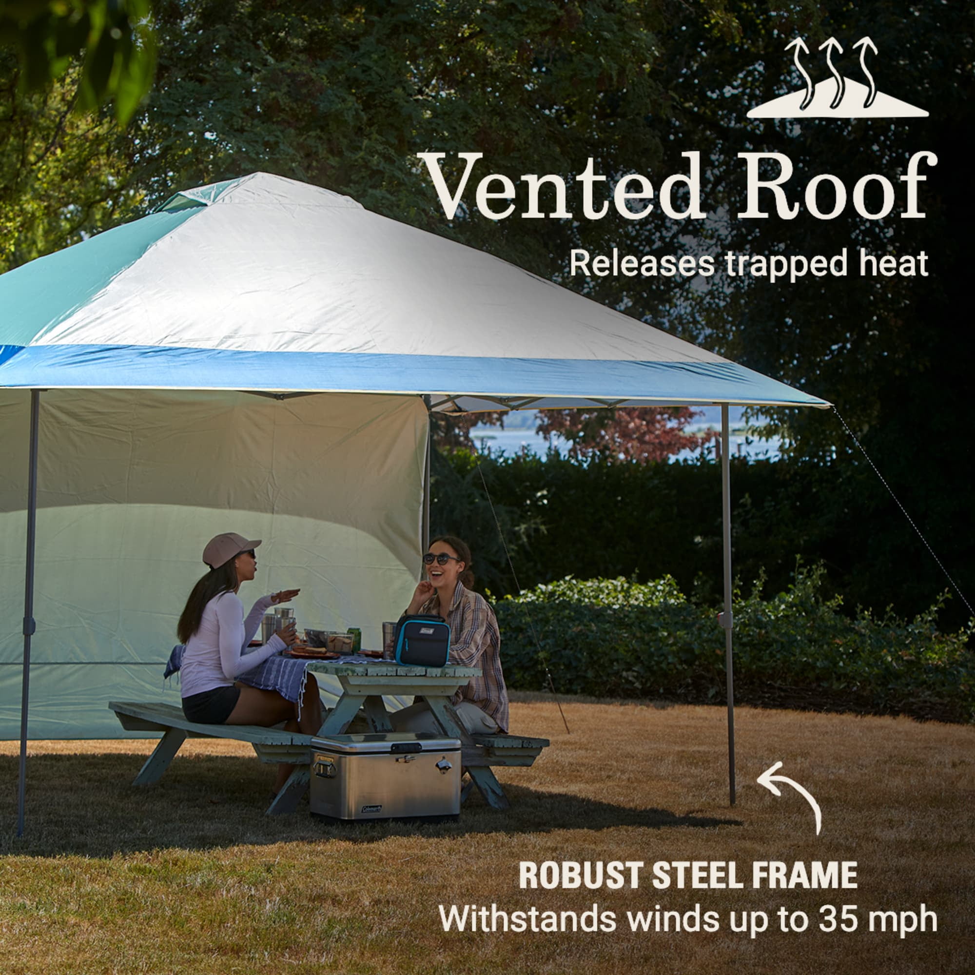 $203.16Great adventures are made in the shade—especially when there’s plenty of it. Meet the Coleman® OASIS™ canopies. Kicking back at the campsite or tossing the frisbee in the park? The Coleman OASIS 13 x 13 Canopy with Sun Wall, Moss sets up easy using a one-push center hub with OnePeak™ technology. Sometimes a little extra shade or wind protection is just what you need, so we made the sun wall easy to clip on any side. The robust steel frame withstands winds up to 35 mph when the canopy is fully staked and the vented roof releases trapped heat so you stay cool even when it’s hot out. Plus, the Comfort Grip™ pinch-free buttons make the canopy easy to set up and take down. UPF 50+ sun protection helps block sun’s harmful UV rays and overhanging eaves provide even more shade. When it’s time to go, the wheeled carry bag makes it easy to pack up and go.
