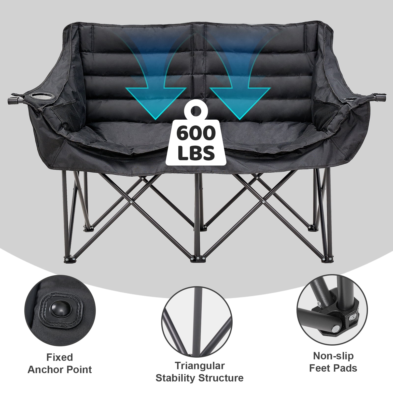 Docred Double Camping Chair for Adults, 2 Person Camping Chair with Cup Holder, Portable Padded Double Folding Chair for Outdoor Camp Lawn Picnic Sports, Support 600LBS (Black)