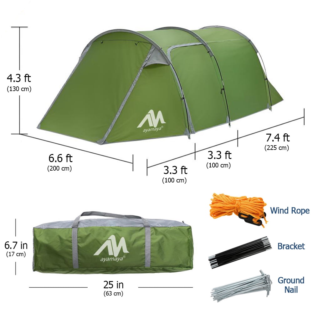 $85.99Why a Tunnel Tent? Tunnel tents are usually winners when it comes to low weight and a bit more spacious. Geodesic or inner tents are freestanding, so offer good stability, but with a tunnel tent you need to peg it in the ground as its structure relies on the traction that you create when doing this Features [2 DOOR VESTIBULE] – The bike tent offers 2 doors in the vestibule to provide excellent ventilation, there are two vents in the front door corner, so you won’t feel stuffy even without the door open. And the vestibule in front is a wonderful storage space, you can store your shoes or some other things under it to the left and right side of the door and have enough room for a dog to join you. [Waterproof] – The waterproof tent consists of 2 functional layers, the liner is made of B3 mesh and 190T breathable Polyester, the outer tent is made of 210T Rip-stop Polyester, it has passed the waterproof test with a rating above 3000mm, offers high performance in extreme weather conditions. [ROOMY ENOUGH FOR 4-5 PERSONS] – The size of the entire camping tent is 14ft x 6.6ft x 4.3ft, the sleeping area is 7.4ft x 6.6ft x 4.3ft, it can accommodate up to 4-5 people, the vestibule is 6.6ft x 6.6ft x 4.3ft, the spacious space enlarges your activity area and storage area. [UPGRADE FIBERGLASS] – 3 shock-absorbing poles can support most heavy wind rain and snow. Stay secure. [D-STYLE MESH DOOR] – Inner tent has a large 2-way zipper D-style door with full mosquito mesh protection and improved ventilation. Front and D-shaped side doors allow you to enter or return without crossing over your partner. [EASY SETUP] – The setup of this tunnel tent is easy and fast, insert the 3 shock-absorbing poles into each sleeve, then fix them with tent stakes, the outer tent is set up, then hang on the inner tent, the setup is finished, it could be done within 5minutes by just one person. Specification Tent Size: 14ft x 6.6ft x 4.3ft Sleeping Room Size: 7.4ft x 6.6ft x 4.3ft Material: Made of upgraded 190T polyester and PU2500 special waterproof coating Weight: 11.3lb Capacity: 4/5 Person Layers: Double Season: 4 Season 2 Rooms: One-bedroom and One-living room Multiple Doors: More convenient and more ventilated Application: Camping, backpacking, travel, hiking, mountaineering, survival, fishing, outing Package included 1 x Tunnel Tent 1 x Storage Bag