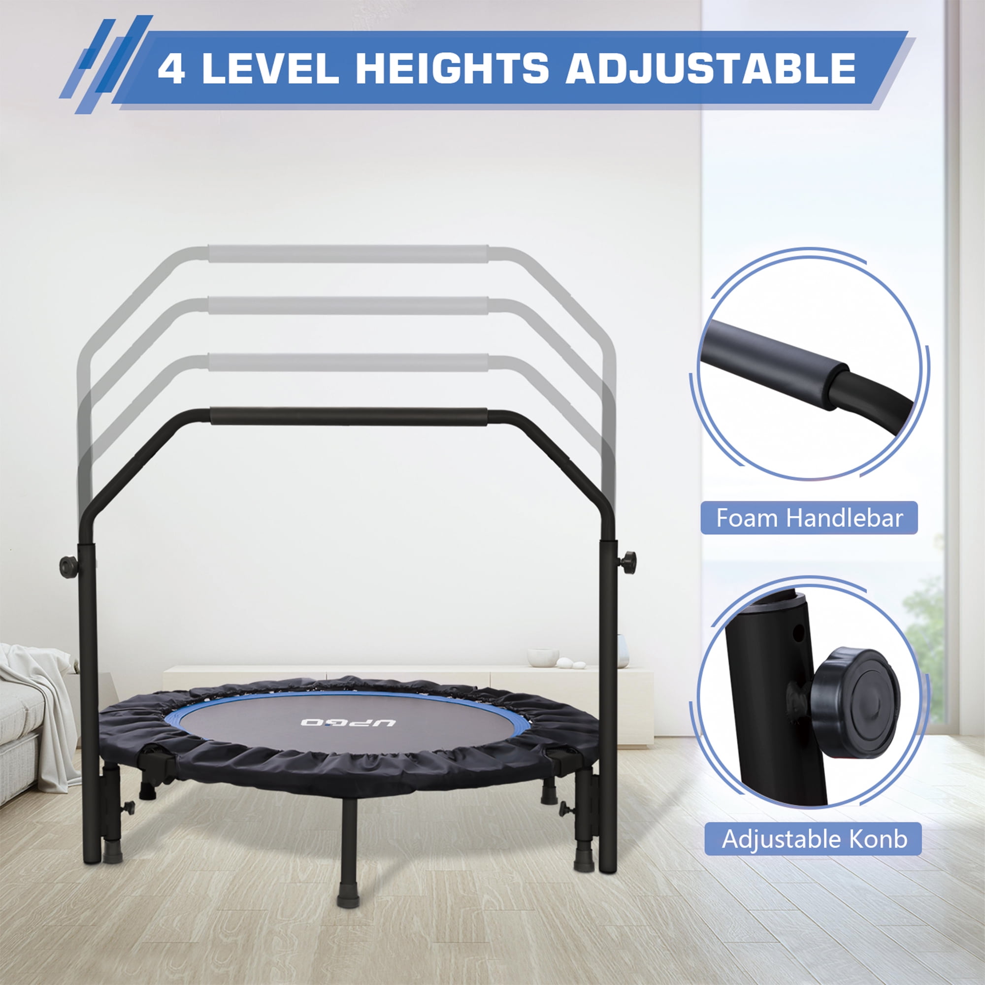$65.27UPGO 48″ Foldable Mini Trampoline Max Load 450lbs, Fitness Rebounder with Adjustable Foam Handle, Exercise Trampoline for Adults/Kids Indoor/Garden Workout a: Maximum load of 450 pounds b: 4 levels heights adjustable foam handle c: Folded size smaller than 1/4 of original d: Sturdy Oxford pad with holes for folding e: Inner-circle consist of resistant waterproof PP mat f: Heavy-Duty steel tubes with anti-slip rubber bottom g: Closed durable anti-scratch smooth steel springs