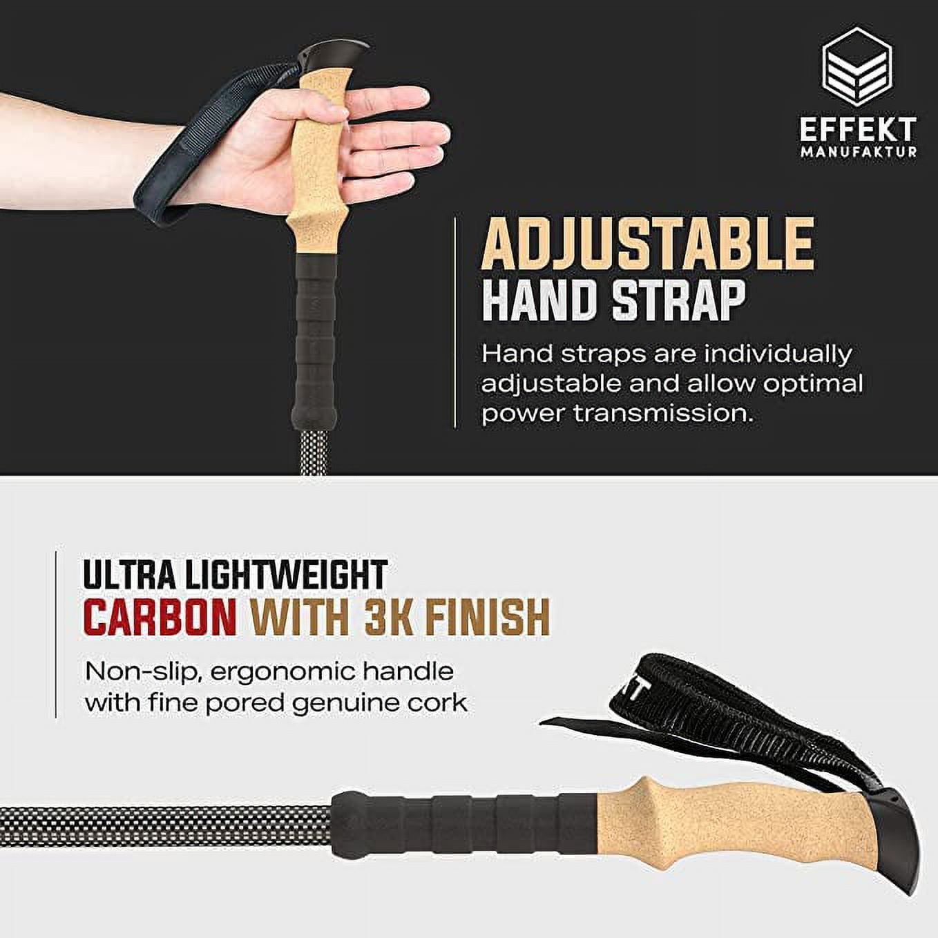 $66.21100% New Brand: Effekt Manufaktur Color: black Features: Made for Adventures Are you constantly searching for undiscovered and breath-taking landscapes? If that sounds like you our carbon fiber walking poles are the perfect travel and adventure companion Tough and Built to Last The classic 3K carbon material of best walking sticks has been reinvented and optimized to every detail to give you a great hiking sticks experience and to withstand pressure and wildest adventure Versatile and Convenient With swappable rubber caps, our adjustable hiking poles for men and women provide perfect grip for every terrain They can be dismantled to a length of 53 cm and are also ultralight at just 225 g per pole Comfort and Stability Our ultralight trekking poles for hiking having quick-lock system features ergonomic cork grip handles and adjustable hand loop to provide maximum comfort and stability Quality You Can Trust Try our telescoping trekking pole out for yourself without any obligation before deciding whether you want to keep them. We’re a German company and stand by our word Part Number: 51234 EAN: 8719326126289 Package Dimensions: 26.8 x 4.7 x 1.2 inches