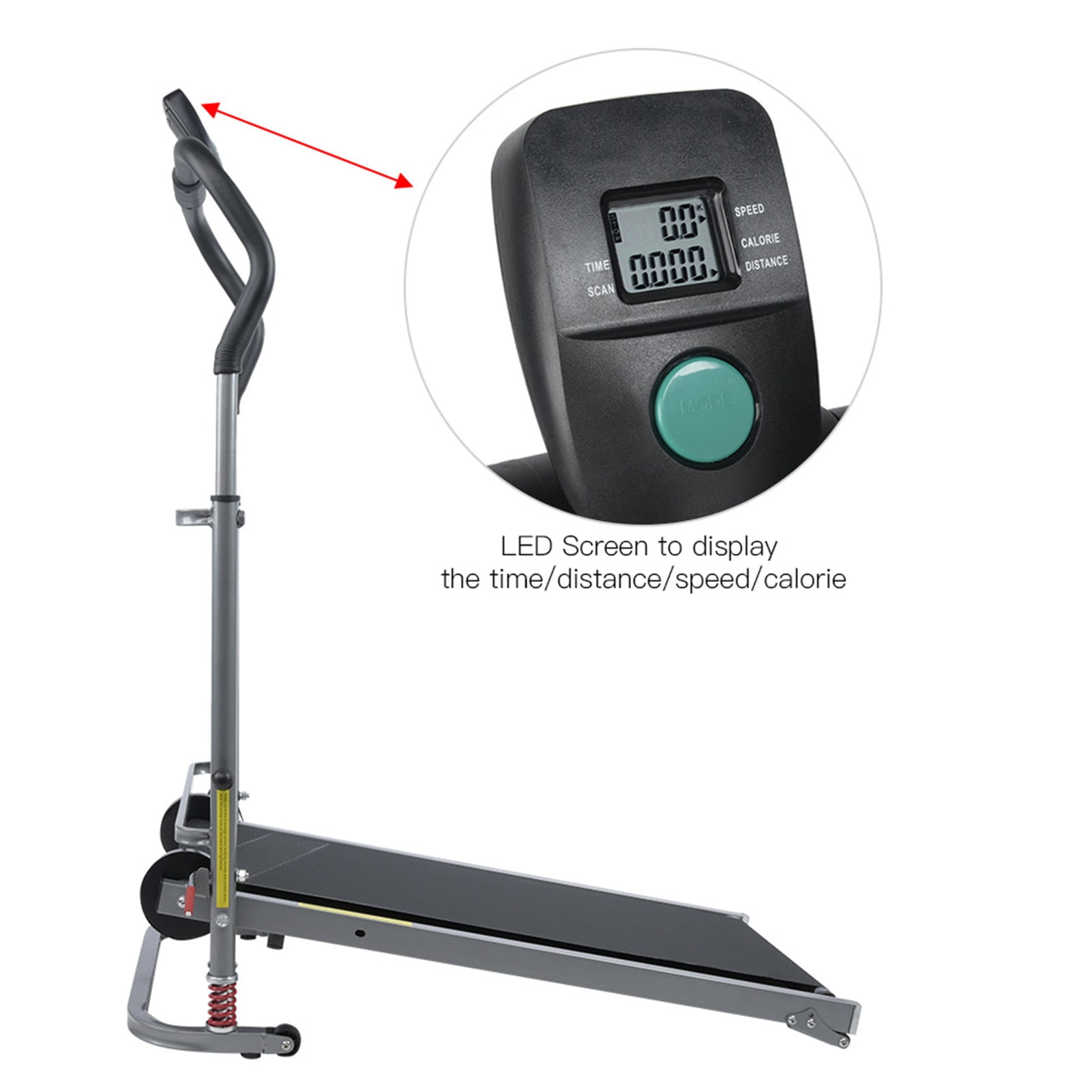 $257.99Original price was: $257.99.$125.55Current price is: $125.55.Begin your fitness journey and start walking on the manual walking treadmill. Improve health as you walk on the treadmill that requires no plugs or electricity. Simply get on and go! Hold onto the soft foam hand grips which allow you to maintain balance as you walk on the slight fixed incline. The incline helps move the treadmill as you walk while also giving you a subtle challenge during walking. The compact walking treadmill is excellent for small studios or apartments. Unfolded size: 37.4″L x 20.5″W x 48.8″H. The small treadmill with transport wheels can be easily folded and rolled away into a closet or from room to room. Folded size: 43.3″L x 20.9″W x 9.1″H. The benefits of walking include increased blood circulation, strengthening of bones and muscles, and an improvement in balance, mood, and coordination. After you complete your cardio session, simply step off using the non-slip, gripped side railings. Keep track of all your fitness progress with the digital monitor. The fitness monitor tracks time, speed, calorie burn, steps, and scan. The sturdy frame supports a maximum weight of 242 lbs. Health and wellness are just steps away with this Manual Walking Treadmill. EXCELLENT CARDIO BENEFITS This affordable treadmill will help you start your fitness journey! Walking can significantly improve mental and physical health. The compact design of the treadmill will get you into shape regardless of home size. COMPACT AND ERGONOMIC This compact, lightweight treadmill is excellent for small spaces. The running belt is 34.6″ x 13″. This treadmill is durable and can withstand power walking or light jogging. DIGITAL MONITOR Track fitness progress on the easy-to-read digital monitor. The monitor displays time, speed, distance, calories. NON-ELECTRIC This space-saving treadmill machine requires no electric outlet and remains low maintenance. Easy folding functionality and transportation wheels allow easy mobility and storage. NON-SLIP RUNNING BELT Feel safe and secure on the smooth belt. The maximum user weight is 242 lbs. Specification: Item Type: Manual Treadmill (NON-ELECTRIC) Unfolded Size: 37.4″L x 20.5″W x 48.8″H Folded Size: 43.3″L x 20.9″W x 9.1″H Running BELT Size: 34.6″ x 13″ Maximum Weight Capacity: 242 lbs Material: Steel Battery: 1 x AA Battery(Not Included) Product Weight: 36.26 lbs Digital Display: display time/distance/speed/calories burned with 2 Different Inclines: 3° and 7° Shock Absorbing design to protect your knees during exercise. The Armrest Height is Adjustable with Dual Flywheels with Transport wheels Package List: 1 x Treadmill 2 x Screw 2 x Screwdriver 2 x Latch 1 x Oil 15g 1 x Manual Note: This product is not electric, and the instrument panel does not have the battery.