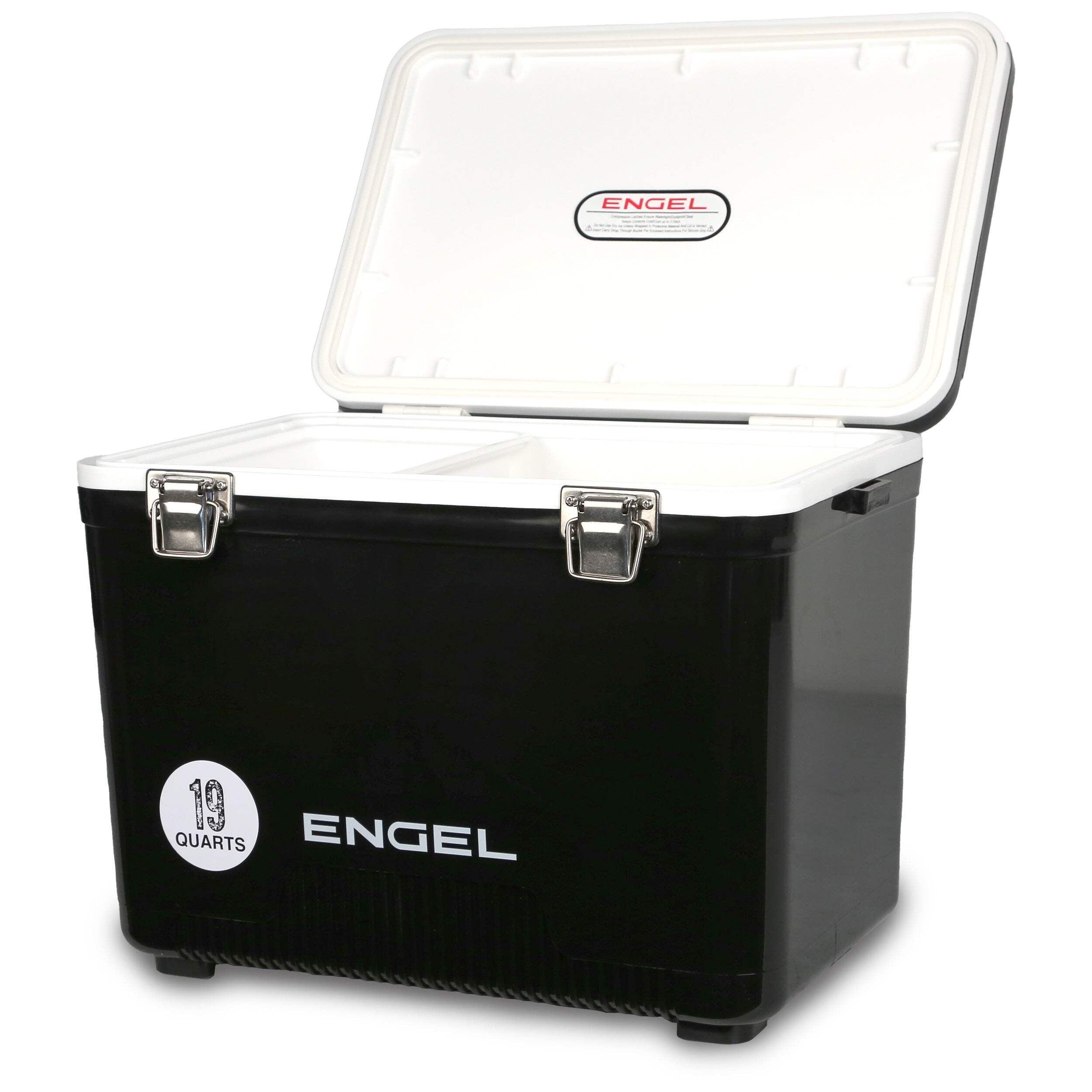 $77.39There are a lot of insulated coolers that promise to keep your drinks cold for days, and the ENGEL 19 Qt Leak-Proof Compact Insulated Drybox Cooler is no different. Except for the fact that it gives you more than that. This 2-in-1 molded Polystyrene Foam insulated cooler has a 30-can capacity, but also performs as leak-proof and airtight drybox to keep moisture away from your valuable electronics, emergency kits, and cameras. You can also use it as ice chest since it can hold up to 25 lbs of ice. With injection molding and heavy-duty gasket seal, this multi-use cooler is built to be tested on the water, in the duck blind, or tied to an ATV. With a lightweight design and convenient carrying handle, this 19-quart capacity ice cooler can handle up to 25 pounds of ice to keep your beverages cold or your meat fresh. The non-absorbent surface is stain and odor resistant so you can pack this heavy-duty hard cooler and drybox combo with whatever you need to have an epic adventure. Donât let heavier coolers weigh you down on your way into the wild. Break free with the utility and versatility of this Insulated Cooler Drybox from ENGEL.