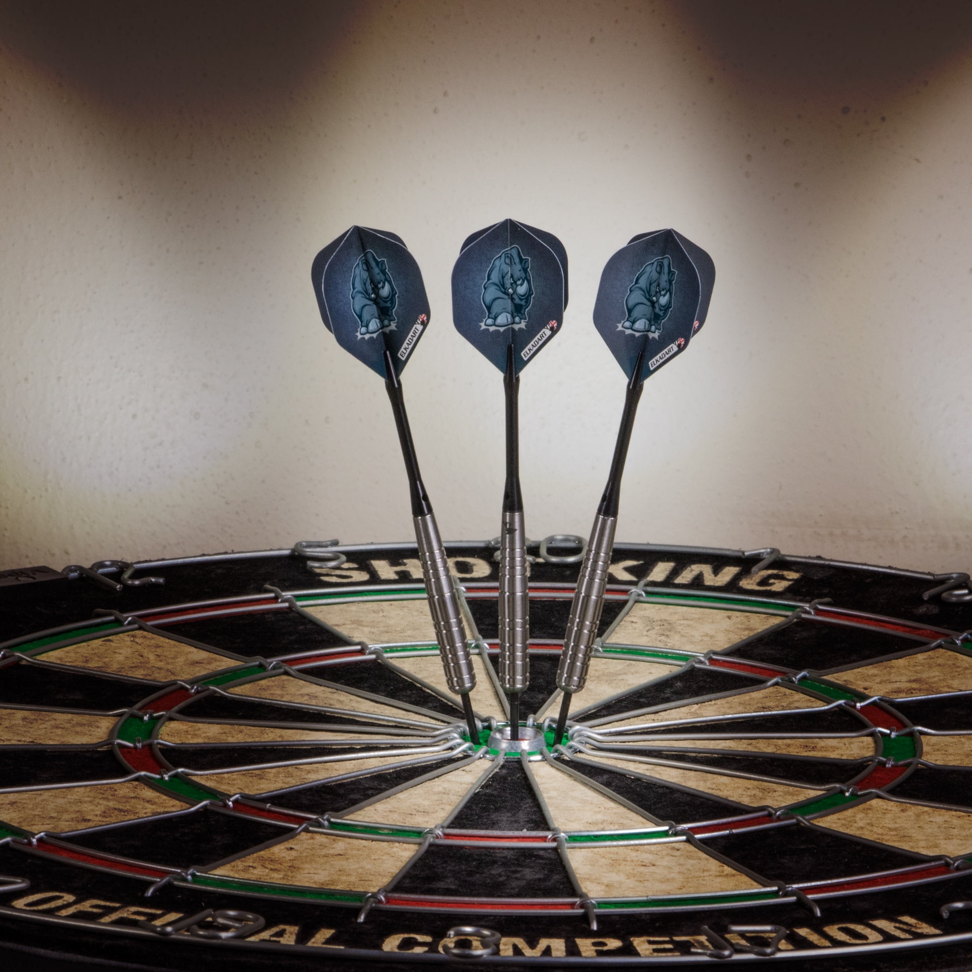 $54.95Original price was: $54.95.$42.29Current price is: $42.29.Charge ahead and trample over the competition when you bring the Elkadart Rhino Steel Tip Darts designed for use with sisal dart boards. These darts are packed with features starting with the barrel, fashioned from 80% Tungsten and 20% Nickel. Tungsten is a very dense metal, able to create slimmer darts with the same weight as lighter metals; this allows for tighter shot groupings without sacrificing control, increasing your scores. Tungsten is a sign of quality and durability as well because of its density. A higher tungsten content will produce a slimmer dart profile than one with less and 80% is among the highest you’ll find in dart set. More tungsten in the dart increases the price as tungsten is a rare metal and its density takes more effort to machine. The increased price gives a higher quality barrel and can improve performance, increasing scores. These darts are heavy duty, with extra weight across all barrel styles. Each barrel enjoys knurled bands and deep grooves, allowing your grip to remain consistent throw after throw. The Rhino Darts feature tough, Nylon Shafts that properly distribute the massive weight of these darts for optimal flight trajectory. Finally, each dart is finished off with intimidating Rhino graphics adorning each wide glide flight, for a menacing look. Each set includes three wide glide flights, and a slim dart case. Made in England.