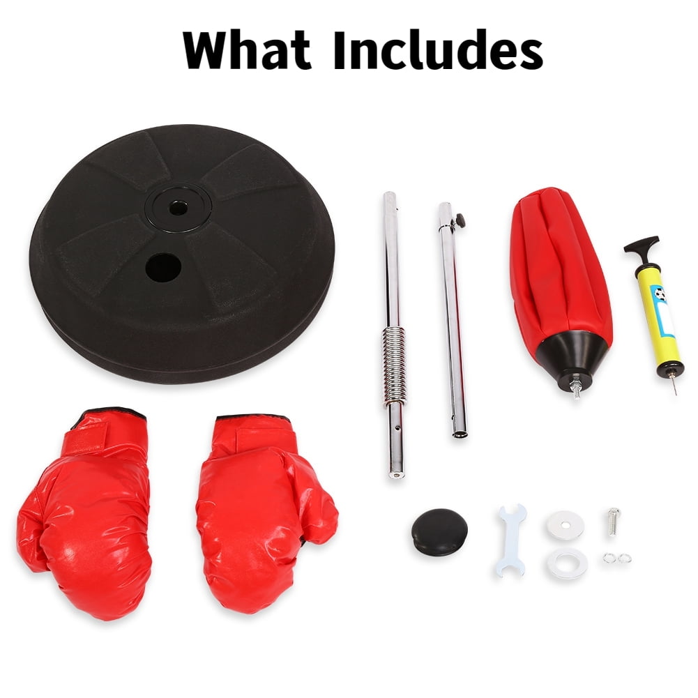$85.99Original price was: $85.99.$36.21Current price is: $36.21.It’s no secret that boxing is more than a knockout sport! It is also a physical fitness sports project. Today, our boxing suits are even more suitable for family games and company time! Knock down your frustration and let you release from the annoying stress of work. Let the child put down the mobile phone, exercise the physical strength and the explosive power of the arm, cultivate the child’s willpower, and improve the concentration. Let’s enjoy some fun boxing together! Multifunctional Punching Bag with Stand Our boxing set includes an inflatable punching bag, air pump, 1 pair of padded boxing gloves, a sturdy base and an adjustable stand. Mobile Gym This portable boxing set can be set up in the basement, garage, yard, home, gym or office. Meet your fitness needs and boxing exercises anytime and anywhere, so your fitness time and location are no longer limited. Adjustable Stand You can adjust the stand to match your most comfortable boxing height. Easily adjust the stand from 49″ to 55″. Not only suitable for adults, but also great for children and teenagers. Rebound Spring The spring at the bottom of the boxing ball can quickly rebound 360°. Ideal for all kinds of punch, kick and combination hitting training, quick rebound. Enough to withstand the stress of boxing for children and junior adult. Great for Stress Relief, Exercise Classes and Boxing Training The comfortable and luxurious gloves provide all-round protection for your hands, allowing you to play boxing games with peace of mind. You can change your fitness regime with our boxing set, which not only helps to increase your heart rate, but is more suitable for helping you develop hand-eye coordination and also allows you to release your work stress through boxing games. Warm Parent-Child Interactive Time This boxing set comes with gloves, and the height can be adjusted freely between 49″-55″. Not only suitable for boxing beginners, but also very suitable for parents to accompany their children for boxing exercises and enjoy enjoyable parent-child time. Easy to Install This boxing set is very easy to install. The base of the stand is filled with sand or water, or a mixture of water and sand. Tighten the top boxing ball and the bottom base to inflate the boxing ball. SPECIFICATIONS: Color: Black&Red Material: PVC+Leather+Iron+PE Height: 49″-55″ Adjustable Package Included: 1 x Base 2 x Boxing Gloves 2 x Poles 1 x Ball 1 x Pump 1 x Lid 1 x Wrench 2 x Gasket 1 x Screw 2 x Rings