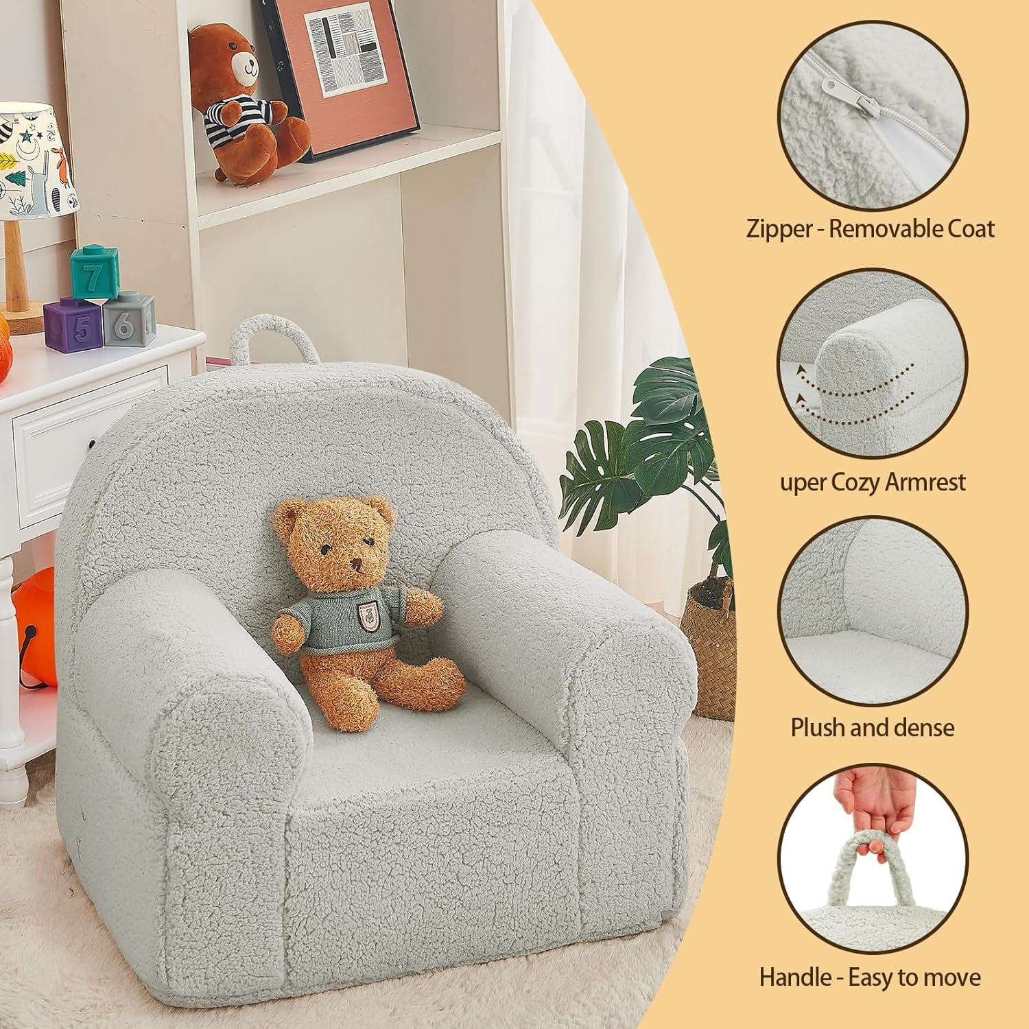 $36.97Original price was: $36.97.$28.37Current price is: $28.37.1. Kids Friendly Design: The comfy kids chair is lightweight for kids to move to any room they want, whether its reading, playing video games, watching tv, or just relaxing, children can play with this sofa as they please. 2. Kids Sherpa Chair Safety and Reliability: The kids sofa chair is made of durable snuggly-soft polyester Sherpa and is filled with premium foam to support kid’s body. The sofa is designed with safety in mind, as there are no sharp corners or hard edges.