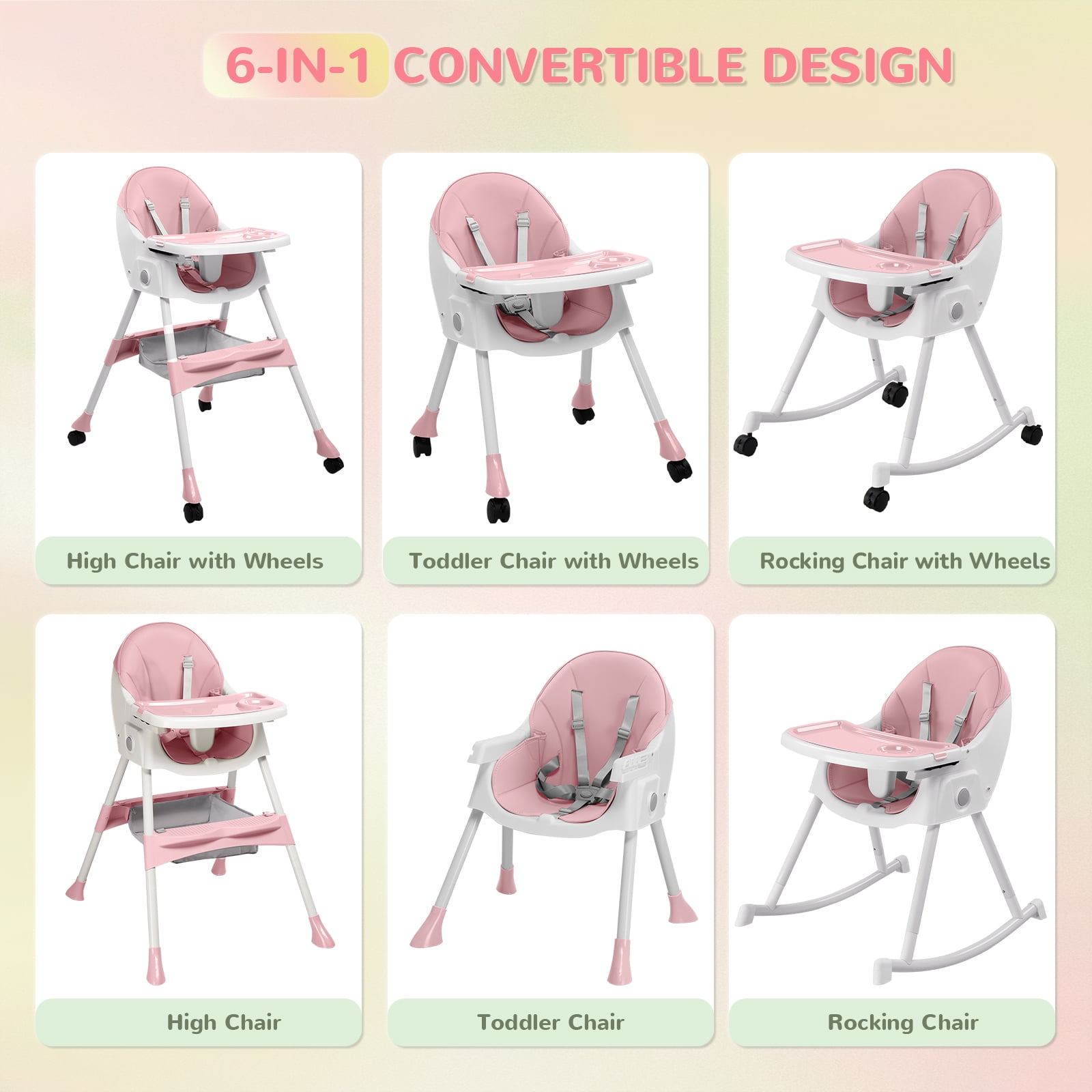 Ktaxon Baby High Chair, Convertible 6 in 1 High Chairs for Babies and Toddlers, Foldable Baby Highchair with 5-Point Safety Harness, Adjustable Dining Tray, Backrest & Height, Pink