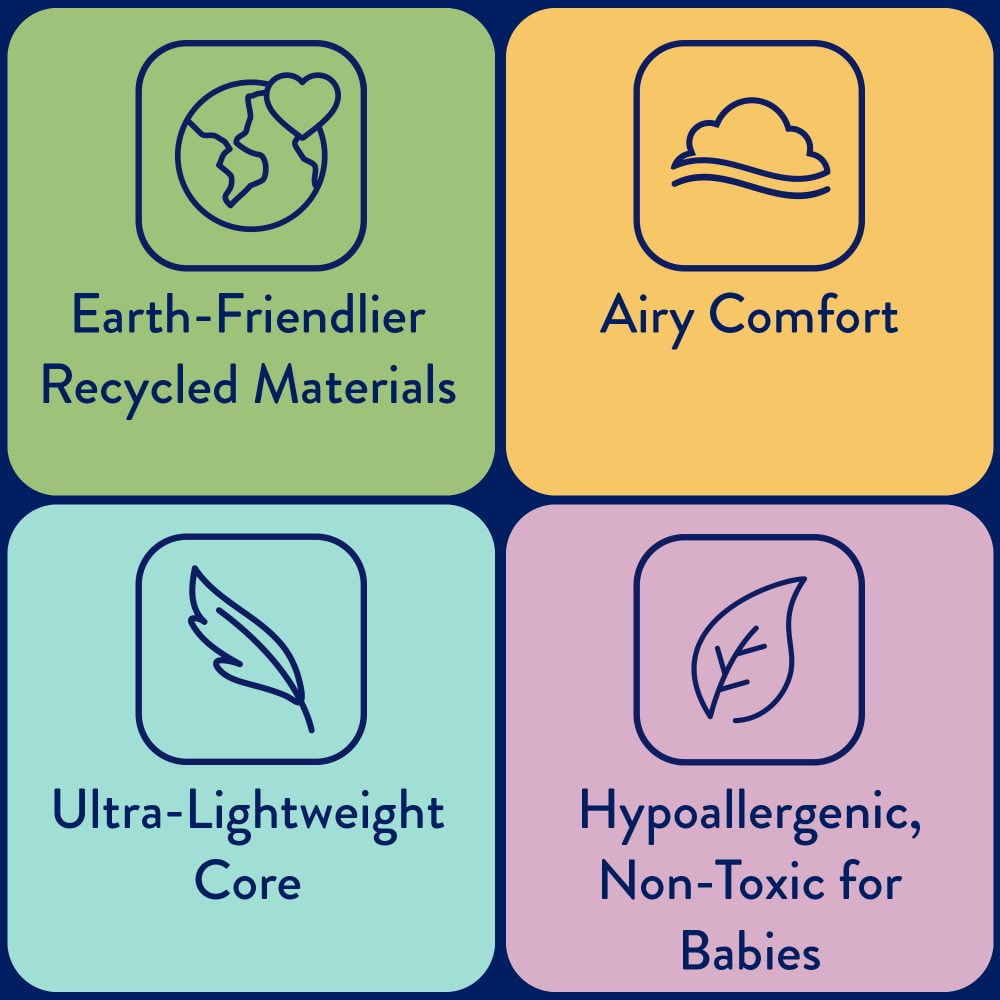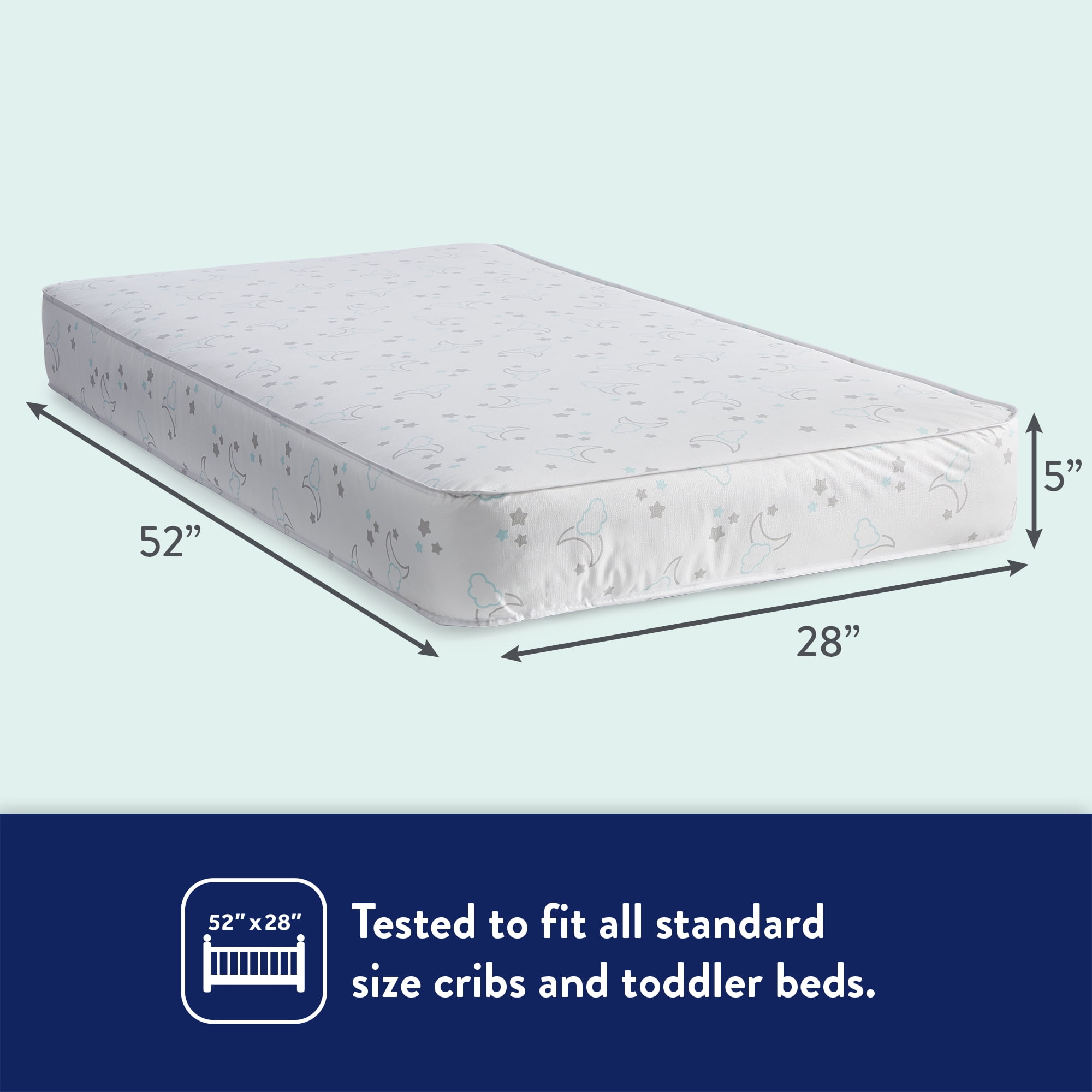 $51.59Kolcraft invented 2-stage dual firm crib mattresses, airflow cover designs, and introduced many sustainably-smart baby mattresses. We never outsource to others to make our crib mattresses, so your family will always get a new, quality tested crib mattress from Kolcraft. Innerspring coil crib mattresses are highly durable and can last forever. Coils are heat-tempered and resilience tested for longevity, making a great solution for growing children! Ultra thick and extra ortho layering helps create a dual comfort top for infants and toddlers. 100% waterproof surface wipes clean. Enhanced with EPA-registered antibacterial protection so bacteria won’t spread on the mattress surface. Every baby crib mattress is ASTM, CPSIA compliant, GREENGUARD GOLD Air Quality Certification, as well as all federal safety regulations. Our crib fit testing device has become an industry standard for a proper fit in your baby’s crib. Each design is a firmness tested to help reduce the risk of suffocation. The Kolcraft Dual Firm Pediatric Premier Crib Mattress and Toddler Mattress features lively patterns including moonlight Stars and Moons, Earthy Woodland Forest Animal Friends, and Dreamy Jungle Safari Animals designed with natural colors for baby girl and baby boy nursery decor. Research shows families prefer antibacterial baby mattresses that are laboratory-tested and validated to help stop the spread of bacteria on baby’s crib mattress. Resists stains and odors! No washing required, simply wipe down with a damp cloth or mild soap and water. An airflow pocket helps the mattress to breathe without any metal zippers or metal holes. Durable 80 coils baby mattress with extra-thick steel. Grow-with-me 2-stage dual firmness means a firmer infant side and a cozier toddler side. Sustainable comfort cushioning on both sides. Air quality certified and made without any flame retardants. Perfect fit in all standard full-size crib and standard full size-toddler bed frames for years of grow-with-me use in baby’s nursery. Ultra-lightweight crib mattress weighs only 10 pounds to easily flip and change crib sheets. 10-year warranty for workmanship and materials.